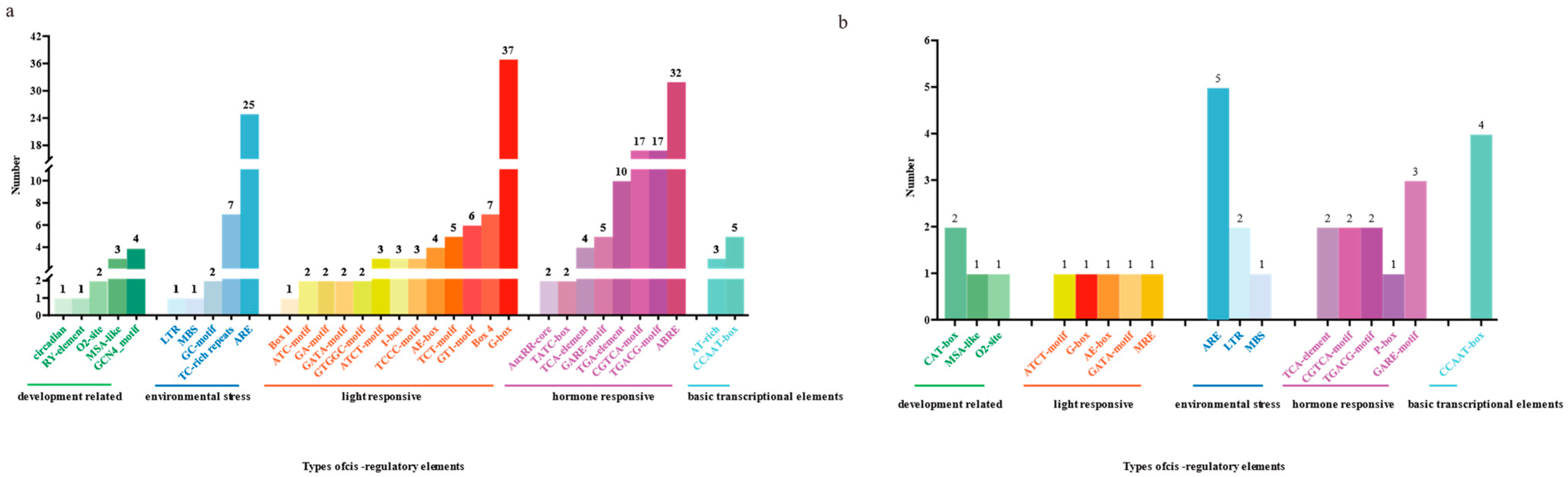 Figure 6. Analysis of cis-acting elements in ChTRX and ChTR gene families. (a,b) Display quantitative statistics of major cis-acting elements, with key abbreviations defined as follows: ARE (Anaerobic Response Element), G-box (Light-Responsive Element), Box 4 (Component of Conserved Light-Responsive DNA Module), AE-box (Light-Responsive Module Component), ABRE (Abscisic Acid Response Element), and TGACG-motif/CGTCA-motif (MeJA-Responsive Elements).