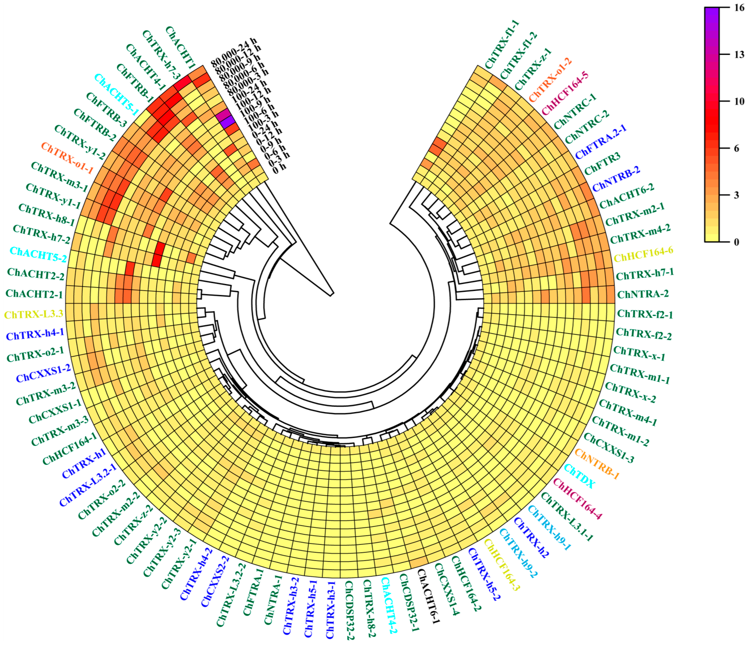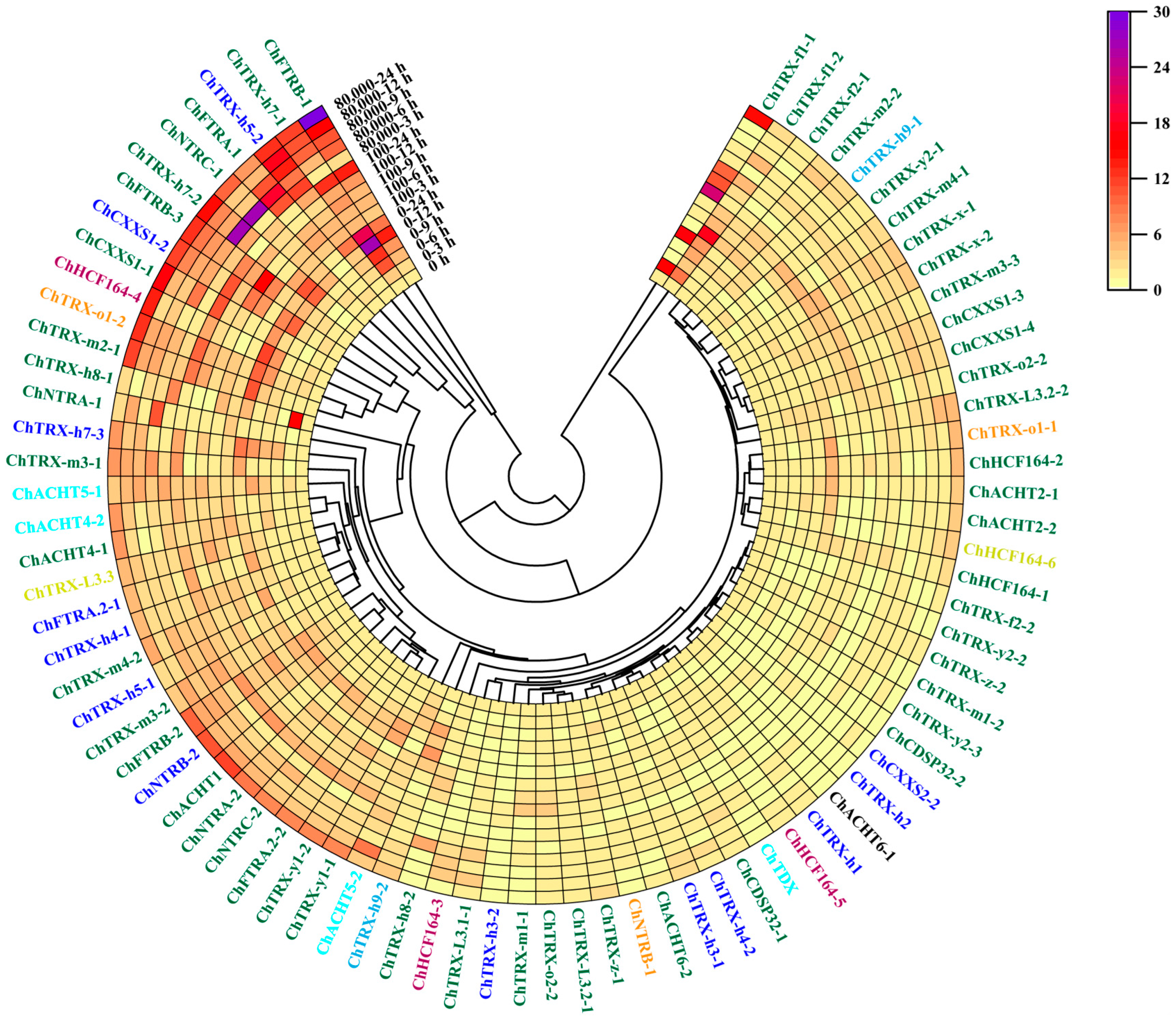 Y.Z. and Q.T. designed the research. Y.L. (Yao Li), H.X. and Z.H. prepared plant materials and completed the bioinformatics analysis of ChTRX and ChTR genes. Y.L. (Yao Li), Y.L. (Yanke Lu) and Z.X. isolated RNA and analyzed the differential expression of the gene. Y.L. (Yao Li), Y.Z. and Q.T. wrote the main text and drew Figures. All authors have read and agreed to the published version of the manuscript.