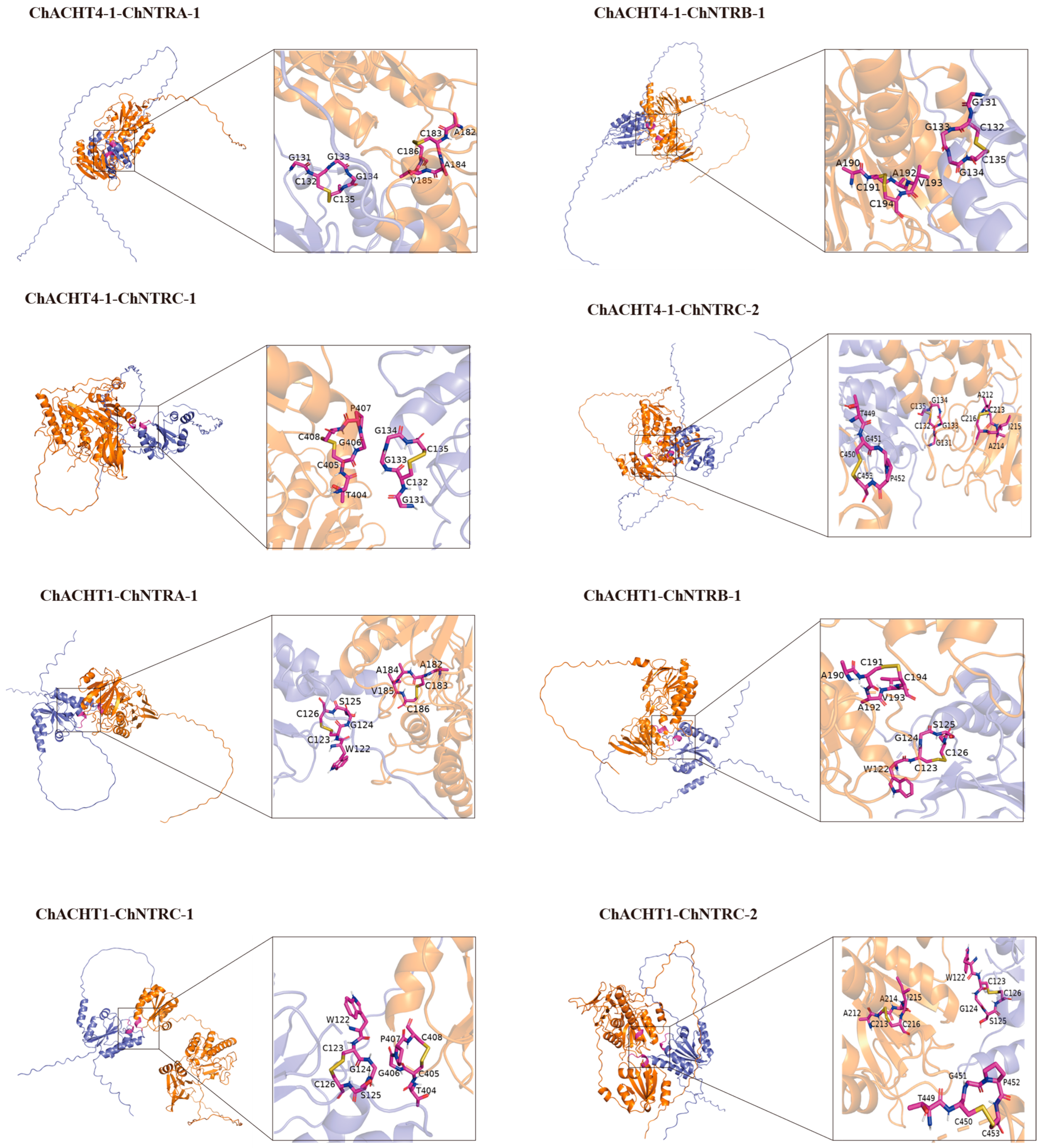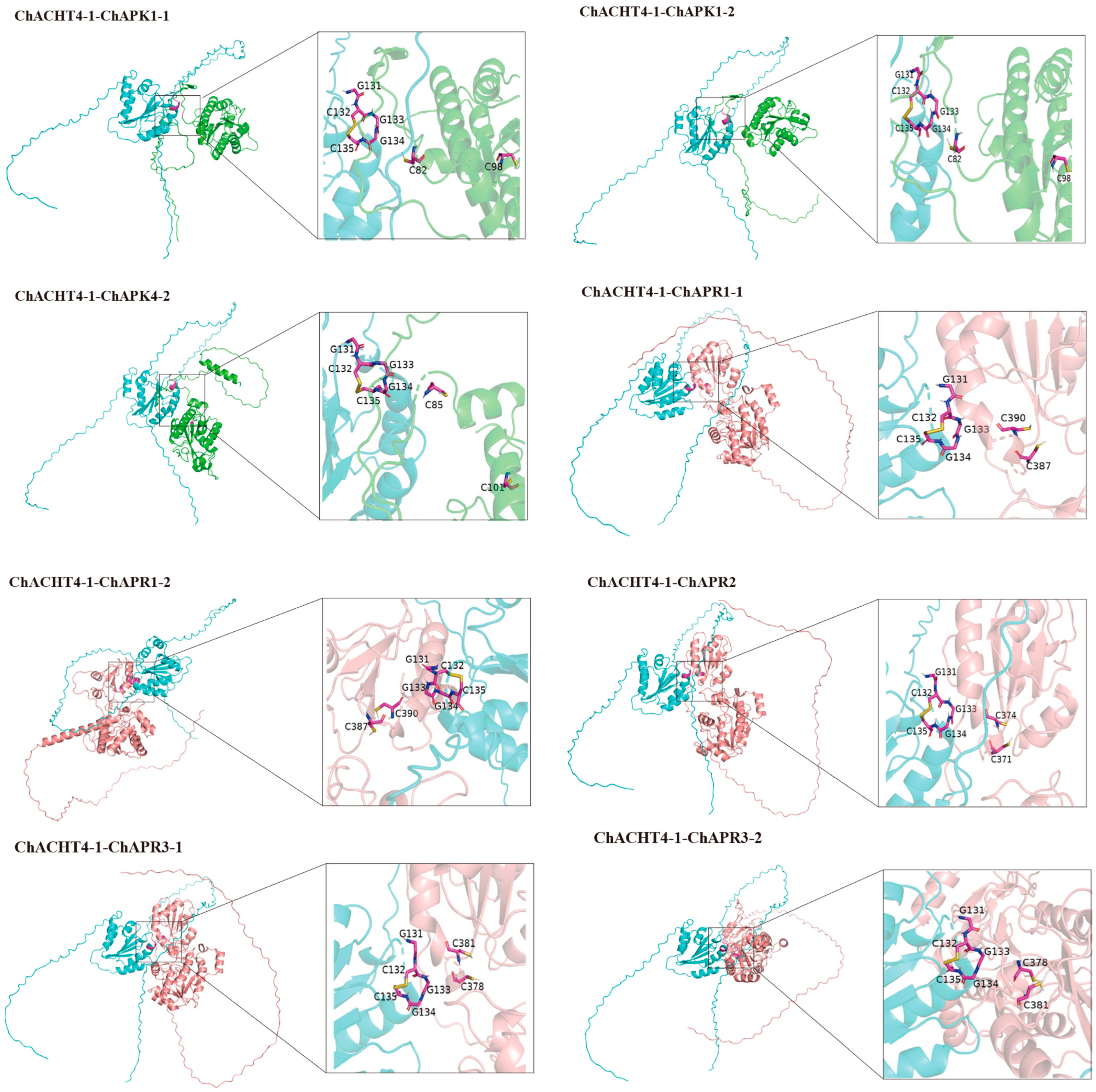 Based on existing research, members ChAPK1-1, ChAPK1-2, and ChAPK4-2 of the APK family possess sites for disulfide bond formation, while all 5 members of the APR family contain sites for disulfide bond formation [48]. Since TRX regulates target proteins’ redox state through disulfide bonds in its redox-active center, this study used the HADDOCK [49] website to predict the redox interactions between TRX and APK/APR. Expression analysis under selenium stress identified five TRX genes with high responsiveness to abiotic stress: ChTRX-y1-1, ChTRX-y1-2, ChTRX-m3-1, ChACHT1, and ChACHT4-1. These were selected for protein-protein docking with members of the APK and APR families. Protein modeling was performed using AlphaFold3, and the oxidized states of the target proteins were generated using Maestro. Docking simulations with reduced ChACHT4-1 revealed that the disulfide bonds at the active sites of all eight target proteins—including ChAPK1-1, ChAPK1-2, ChAPK4-2, ChAPR1-1, ChAPR1-2, ChAPR2, ChAPR3-1, and ChAPR3-2—were reduced. Concurrently, a new disulfide bond formed between Cys132 and Cys135 within the GCGGC active site of ChACHT4-1 (Figure 9 and Figure S4). These results indicate that ChTRX can regulate the reduction process of APK and APR proteins.