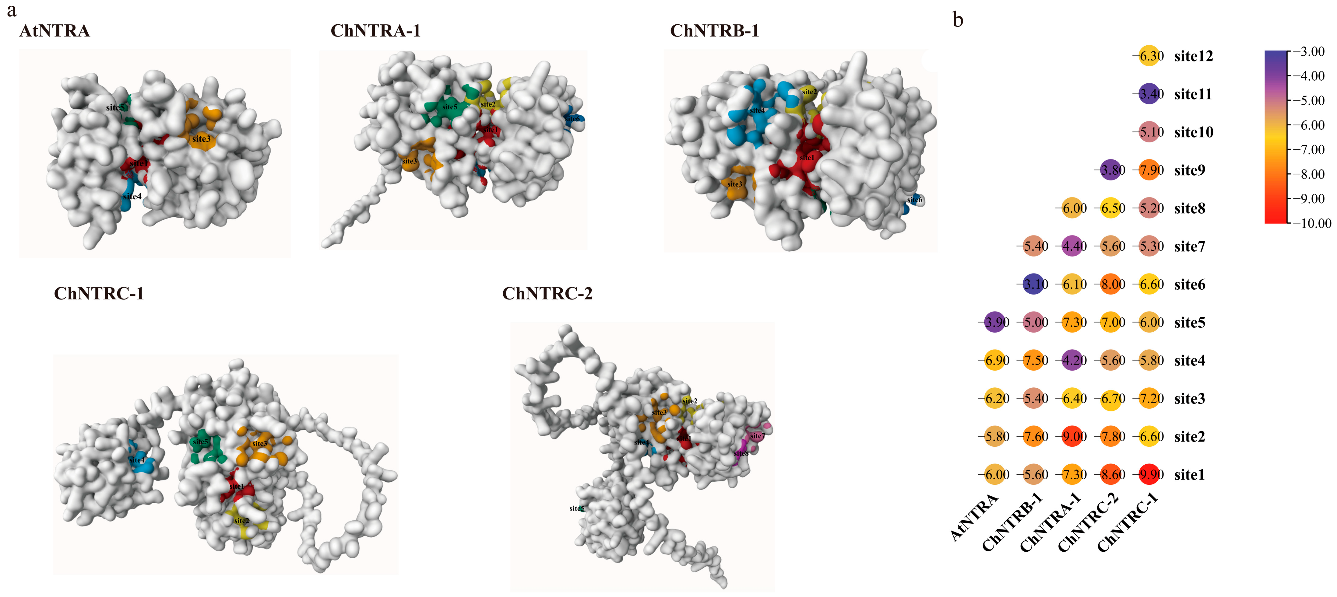 Figure 11. Auto Dock Vina performed molecular docking between ChNTR proteins and FADH2. (a) Illustrates the predicted ligand-binding sites on these proteins, visualised using PrankWeb website. (b) Displays the binding energies of AtNTRA, ChNTR with FADH2.In the heatmap, the horizontal axis (bottom) lists the gene names, the vertical axis represents the ligand-binding sites, and the values indicate the binding energies (in kcal·mol−1) derived from protein-ligand docking.