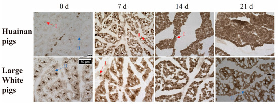 Myosin ATPase staining of longissimus dorsi muscle of Huainan pigs and Large White pigs at four postnatal stages (0, 7, 14, and 21 days). I, type I fibers (dark brown); II, type II fibers (light brown); n = 3 biological replicates per group.