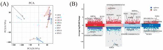 Transcriptome sequencing data analysis. (A) PCA. (B) Differentially expressed genes between Huainan pigs and Large White pigs at four postnatal stages (0, 7, 14 and 21 days). Red and blue dots represent genes with higher and lower expression in Huainan pigs, respectively. Each dot represents a gene. Key genes mentioned in the text (e.g., KLF4, NOS1, SH3KBP1, TRARG1) are highlighted. HN represents Huainan pigs; LW represents Large White pigs.