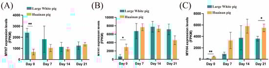 We analyzed the expression levels of marker genes associated with different muscle fiber types. At day 0, the oxidative muscle fiber marker gene MYH7 [11] expressed significantly higher in Large White pigs compared to Huainan pigs (Figure 3A and Supplementary Table S3), while the glycolytic muscle fiber marker genes MYH1 and MYH4 [11] showed significantly higher expression levels in Huainan pigs compared to Large White pigs (Figure 3B,C and Supplementary Table S3). These expression patterns of muscle fiber type-specific marker genes are consistent with the muscle fiber phenotypes observed through ATPase staining at day 0. At day 21, the expression level of MYH4 in Huainan pigs remained significantly higher compared to Large White pigs (Figure 3C), suggested that Huainan pigs had stronger development activity of glycolytic muscle fiber than Large White pigs at this stage.