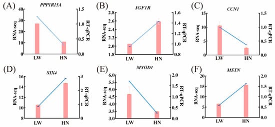 qRT-PCR validation of differentially expressed genes identified by RNA-seq. (A–F) respectively show qRT-PCR and RNA-seq validation of PPPR11A, IGF1R, CCN1, SIX1, MYOD1, and MSTN genes. Pink bars represent relative mRNA levels detected by qRT-PCR; blue lines represent FPKM values from RNA-seq data (transcriptome sequencing of 21-day-old longissimus dorsi muscle). Data are presented as mean ± SEM (n = 3 biological replicates per group). HN represented Huainan pigs; LW represented Large White pigs.