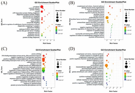 GO enrichment analysis of DEGs between Huainan pigs and Large White pigs at Day 0 (A), Day 7 (B), Day 14 (C), and Day 21 (D). Rich factor represents the proportion of DEGs in a certain GO term to the total number of genes in that GO term. The size of the circles in this figure represents the approximate range of the number of genes, not the specific number. For the specific number of genes in each pathway, please refer to Tables S6–S9.