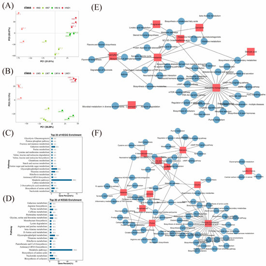 Metabolomics data analysis. PCA of metabolomic data in Huainan pigs (A) and Large White pigs (B). KEGG enrichment analysis of differential metabolites in Huainan pigs (C) and Large White pigs (D). Network diagram of the regulatory relationship between differential metabolites and KEGG pathways in Huainan pigs (E) and Large White pigs (F). HN represents Huainan pigs; LW represents Large White pigs.