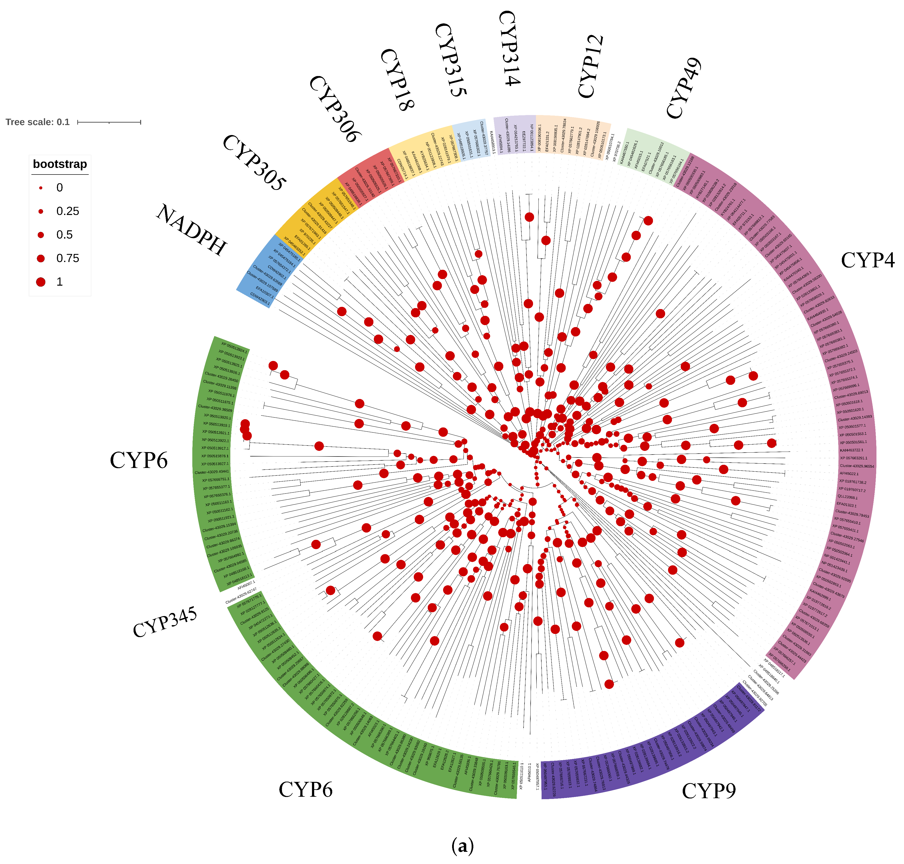 - Wang, Y.Q.; Li, G.Y.; Li, L.; Song, Q.S.; Stanley, D.; Wei, S.J.; Zhu, J.Y. Genome-wide and expression-profiling analyses of the cytochrome P450 genes in Tenebrionidea. Arch. Insect Biochem. Physiol. 2022, 111, e21954. [Google Scholar] [CrossRef]