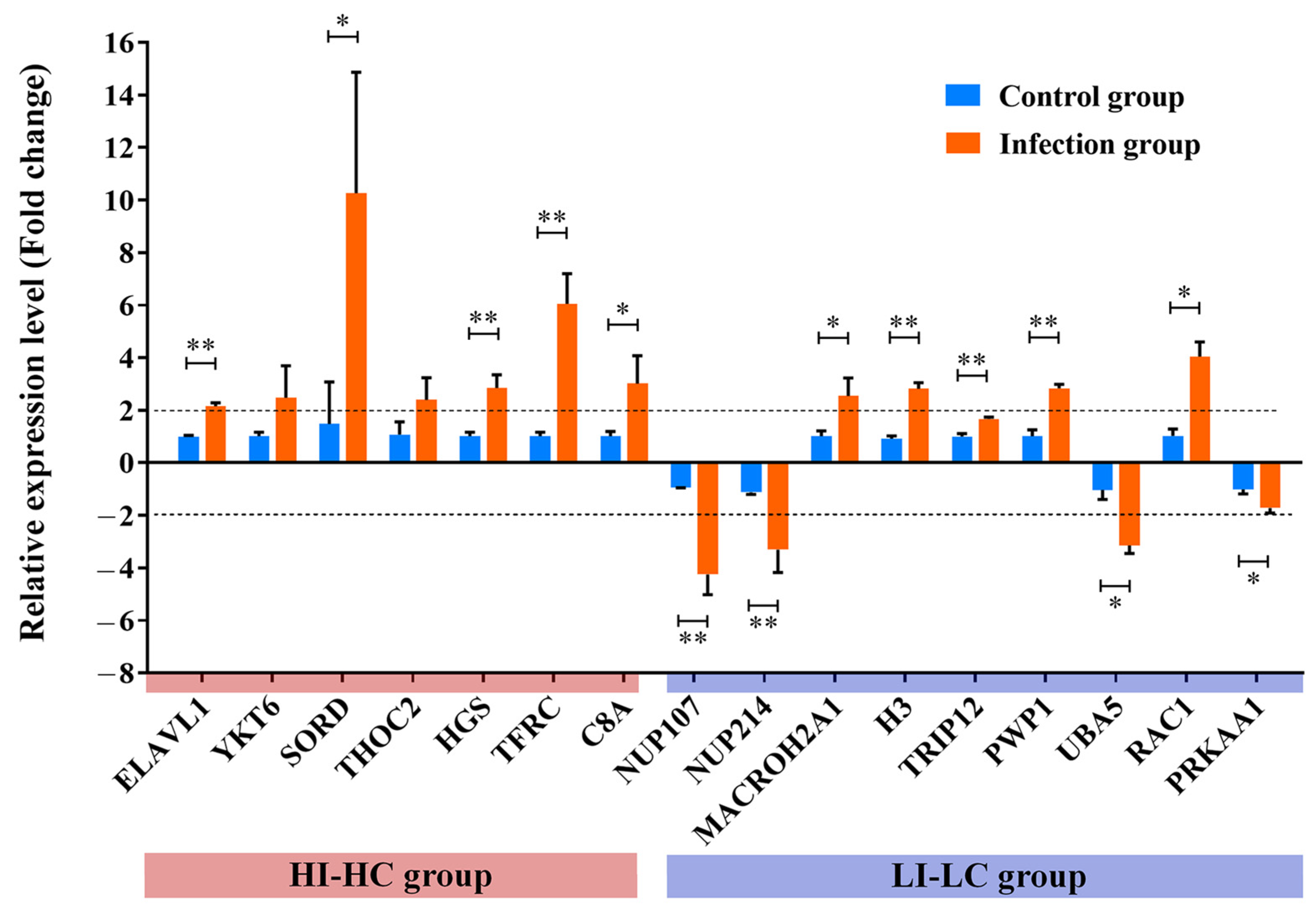 XP_019935975.1 | CHD1L | 8 | −∞ | NA | Down | XP_019954034.1 | POLR2H | 9 | −2.06 | 2.10 × 10−2 | Down |