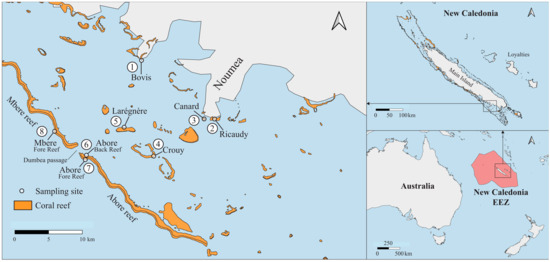 The present research was conducted in the South West Lagoon of New Caledonia (SWLNC) in April 2012 (Figure 1). The SWLNC is a semi-enclosed lagoon approximately 120 km long and 20 km wide with an average depth of 17.5 m (Figure 1). This region is characterized by a tropical climate that influences its oceanographic conditions. Seawater temperatures in the SWLNC typically range from approximately 22 °C in the austral winter (July–August) to 28–30 °C in the austral summer (January–February). Seasonal temperature variation in the lagoon is notably greater than its interannual variation, with temperatures in bays generally higher during summer and lower during winter compared to the open lagoon [37]. Salinity generally averages around 35.5 practical salinity units (PSU) [38] exhibiting minor seasonal fluctuations primarily influenced by rainfall and terrestrial runoff, especially during the wet season [37]. Both seasonal and interannual variations in salinity are amplified nearshore areas [37]. Long-term monitoring efforts in the region have indicated a slight warming trend of ~0.6 °C observed in the twentieth century coral Sr/Ca–SST record [39], although this is accompanied by notable decadal fluctuations [40].
