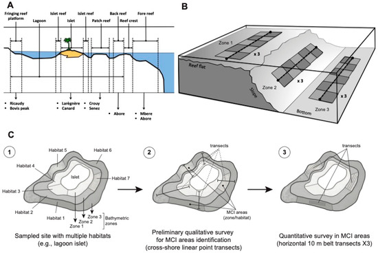 Figure 2. Schematic representation of the type and bathymetric zones investigated, and sites selection during this study along a shore to fore reef gradient (A,B). Illustration of the exploration of macroalgal–coral interaction (MCI) for example in a lagoon islet reef displaying three zones and varied habitats (C) (1), the MCI areas were identified through cross-shore linear point transects during the preliminary survey (2), then MCI were quantified in the selected MCI areas using triplicate belt transects in the selected habitats during the quantitative survey (3).