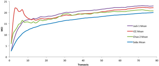 ICE provides a distinction between frequently and infrequently occurring species during analysis. Jack 1 does not differentiate based on species frequency and relies on the count of MCI found only once. Chao 2, on the other hand, takes into account the number of unique units and duplicates. The MCI sample-based data served as the foundation for calculating these three richness estimators using EstimateS version 9.1.0 [46]. This approach facilitated a comprehensive assessment of the MCI richness within the study area.