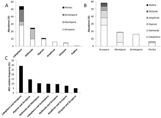 Figure 6. Macroalgal–coral interactions in the South West lagoon of New Caledonia. (A) Relative abundance (in percentage) of dominant coral taxa (Lobophora, Halimeda, Hypnea, Amphiroa, Dictyota, Padina) showing the proportional contribution of various coral genera (Porites, Seriatopora, Montipora, Acropora) to the overall abundance within each dominant coral group. (B) Abundance (in percentage) of specific coral genera (Acropora, Montipora, Seriatopora, Porites) showing the proportional contribution of different macroalgae (Padina, Dictyota, Amphiroa, Hypnea, Halimeda, Lobophora) interacting with them. (C) Relative frequency of different macroalgal–coral interaction types (e.g., Lobophora and Acropora, Hypnea and Acropora, Halimeda and Seriatopora, etc.) based on the Macroalgal–Coral Interaction (MCI) index.