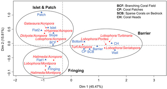 To unveil the intricate relationships between MCI and habitat variables such as reef type, reef zonation, and benthic cover, a comprehensive multiple correspondence analysis (MCA) was conducted. The MCA results elucidated the close associations between specific MCI and distinct habitats. The first dimension of the MCA, accounting for 45% of the variability, notably segregates the barrier reef from other reef types (Figure 7). Furthermore, the second dimension, contributing to 16% of the variability, predominantly distinguishes the fringing reefs from the islet reefs (Figure 7).