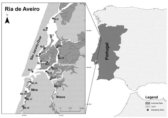 Geographic location of Ria de Aveiro, Portugal (40°37′20″ N; 8°44′22″ W) with reference to Cerastoderma edule sampling locations (blue spots, from L1 to L18) distributed along the four Ria de Aveiro’s channels: São Jacinto-Ovar (S), Espinheiro (E), Ílhavo (I), and Mira (M).