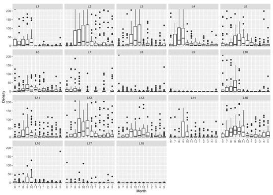 Differences in density between sampling locations and time were tested using a two-way ANOVA (18 location × 12 months) in the R statistical programming language (version 4.3.1), after applying a square root transformation and confirming homogeneity of variance with a Levene’s test. Location and time were included as main effects, with an interaction term indicating whether the magnitude of change throughout the year differed among sampling locations.