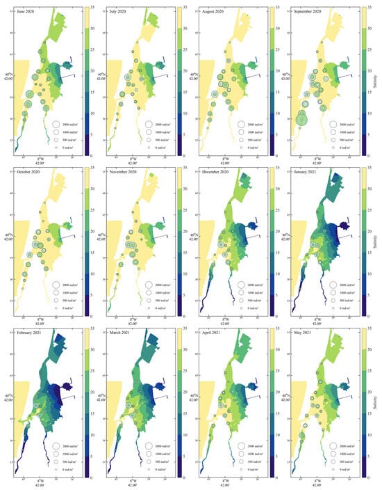 For their significant influence on cockles’ density, salinity, temperature and current velocity were mapped. Salinity (Figure 3) exhibited a pronounced spatial gradient throughout the year, consistently decreasing from the northern marine-influenced areas toward the southern and inner lagoon zones. Seasonal variation was also evident: highest salinity levels (>30) occurred in the northern region during summer (June–August 2020) and again in late spring (May 2021), while lower salinity values (<15) were recorded in the southern areas during winter and early spring (December–March). Cockle recruits were primarily found from June to October 2020, particularly in zones with intermediate salinity (15–25), suggesting a preference or tolerance for mesohaline conditions during settlement. Adult distributions appeared broader and more stable, occurring across a wider range of salinities, though with higher densities generally in regions with moderate to high salinity.