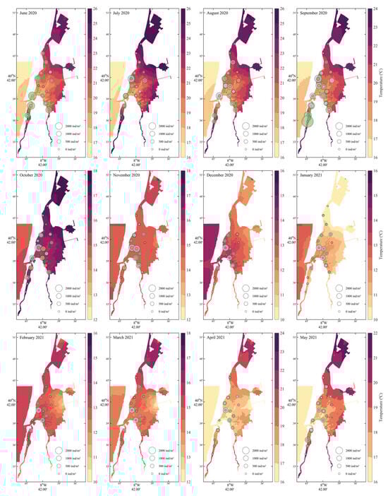 Seasonal temperature fluctuations were clearly delineated (Figure 4), with summer months (June–September 2020) exhibiting the highest temperatures (>22 °C), particularly in the northern and mid-lagoon regions. A sharp decline in temperature began in October, reaching annual minima during winter (December 2020–February 2021) with values dropping below 13 °C in the southern and inner lagoon zones. Temperatures then gradually increased from March to May 2021. Cockle recruits were predominantly present during warmer months (June to October 2020), with peak densities observed in August and September when water temperatures ranged from ~19 °C to 23 °C. These recruits were mainly located in the central and southern portions of the lagoon, coinciding with moderately warm areas. Adult cockles were found throughout the year, but densities were highest during cooler months (October–February), particularly in the southern and central regions.