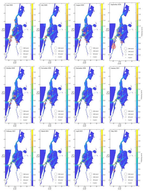 Velocity patterns (Figure 5) exhibit clear seasonal variation, with higher intensities generally observed in late spring and summer months (e.g., June–August 2020, and May 2021), particularly along the central channel and southern sections of the lagoon. Lower velocities prevailed during winter months (December–February), especially in the northern and inner lagoon zones. It is possible to observe some overlap between high current velocities and reduced recruit densities. Adult distribution appeared more stable and less associated with short-term velocity shifts.