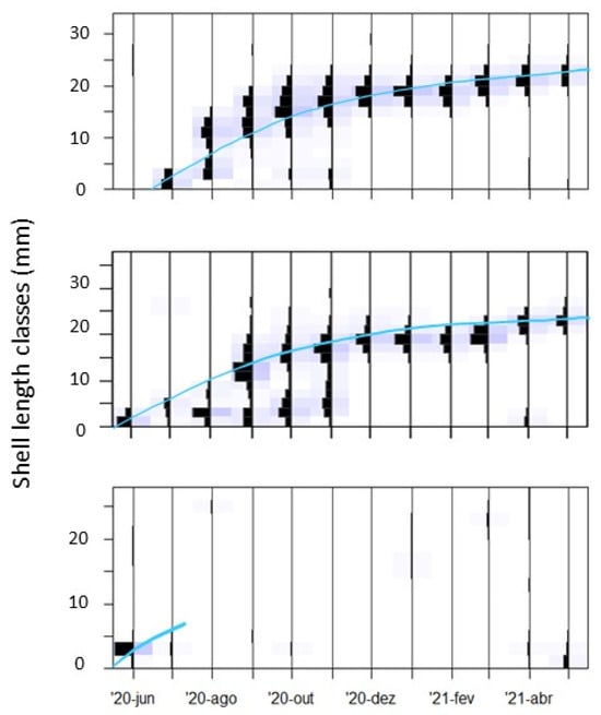 Lt = L∞ [1 − e − K(t)], where L∞ is the asymptotic shell length (mm) and K is the growth coefficient (year−1).
