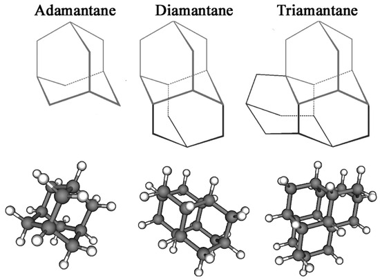 Adamantanes are a class of condensed, carbocyclic alkanes with a three-dimensional, polycyclic structure in which the carbon atoms are in an sp3 hybridisation state. These adamantane compounds are considered nanoscale fragments of the diamond lattice and are characterised by high symmetry and a unique set of physicochemical properties. The simplest representative of almasoids is adamantane (C10H16) (Figure 1), which has Td group symmetry. It is characterised by the presence of two types of hydrogen atom position in C–H bonds: four equivalent tertiary bridge positions and six methylene segments forming a tricyclic cell-type framework. Just as diamond is a hard, mechanically strong allotropic form of carbon, diamondoids are condensed hydrocarbon structures with high thermodynamic stability whose general empirical formula is C4n+6H4n+12. This series of compounds includes molecules with clearly defined geometries, such as diamantane and triamantane (see Figure 1), as well as less regular nanoscale forms known as ‘nanodiamonds’, which have even been discovered in interstellar space [20].
