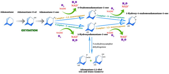 Studies have shown that the oxidation of the adamantane nucleus occurs with high regiospecificity, suggesting that the hydroxylation of adamantane is likely associated with the activity of cytochrome P450cam-methylene monooxygenase (camphor-5-monooxygenase). Production of this enzyme complex is induced when bacteria are cultivated in a medium where camphor is the sole source of carbon and energy. As previously established, camphor-5-monooxygenase functions as a multi-enzyme ensemble in the bacterial system, including the thioredoxin reductase, thioredoxin and cytochrome P450cam pathways [62]. The expression of the corresponding operon is initiated not only by D-camphor, but also by several of its analogues and degradation products, such as adamantane, 2-adamantanol, 5-exo-hydroxycamphor, D-3-bromocamphor and 2,5-diketocamphane.