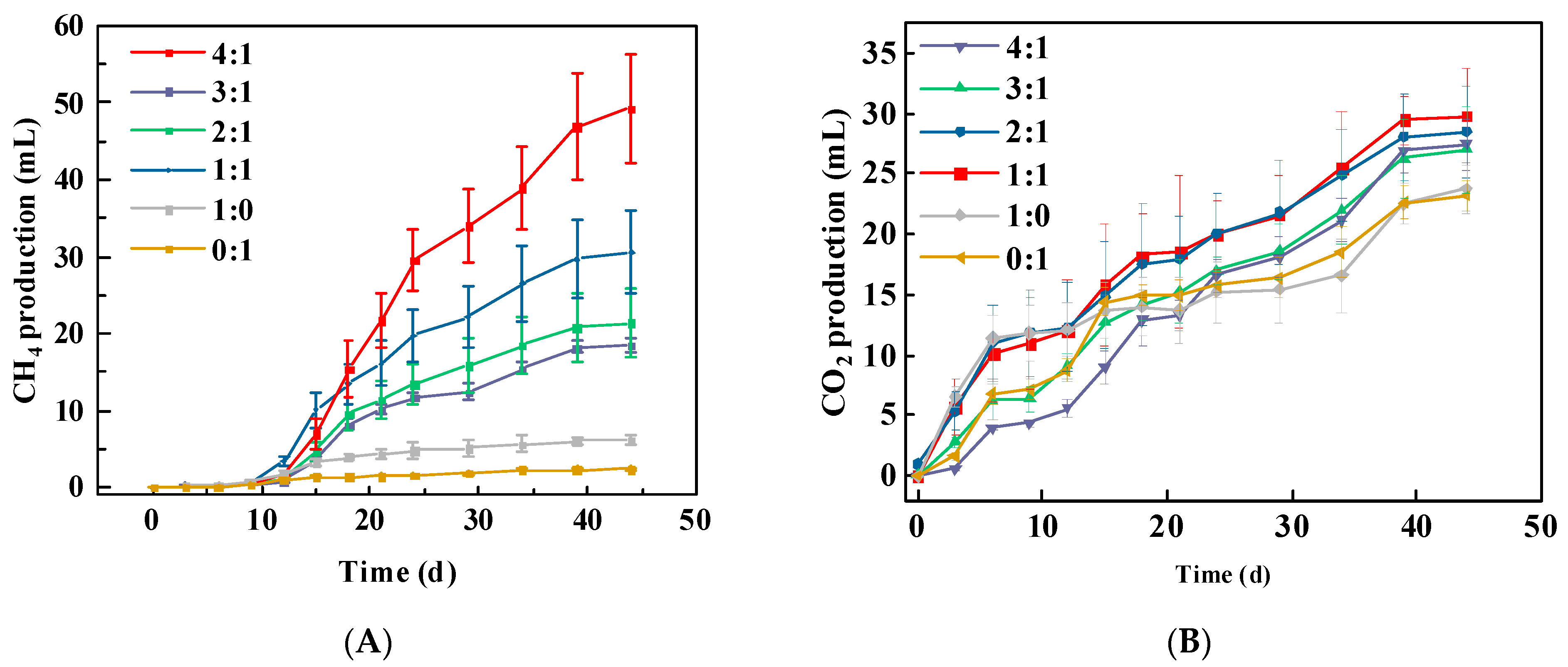 35]. Surprisingly, in this study, compared with coal-alone degradation, the 4:1 group showed a significant increase in methane yield, up to 7.97 times higher (