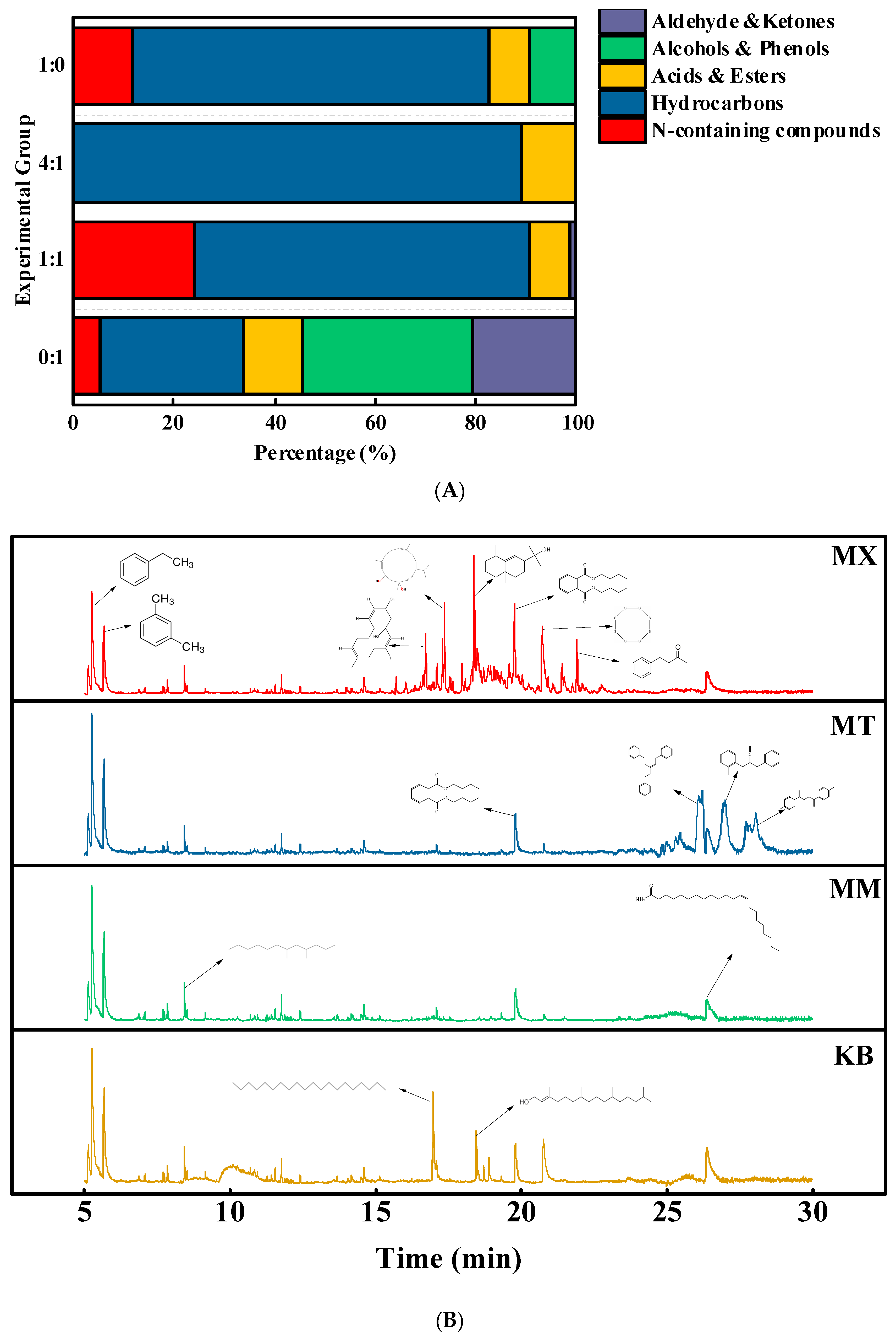 42], which is consistent with the findings of this study. Elevated levels of ethylbenzene and xylene were detected in the mixed groups. This result indicates that adding sawdust accelerated the ring-opening and cleavage processes of aromatic hydrocarbons. Furthermore, fatty acids, lipids, and organic acids, which are key products of microbial fermentation and metabolic activity [