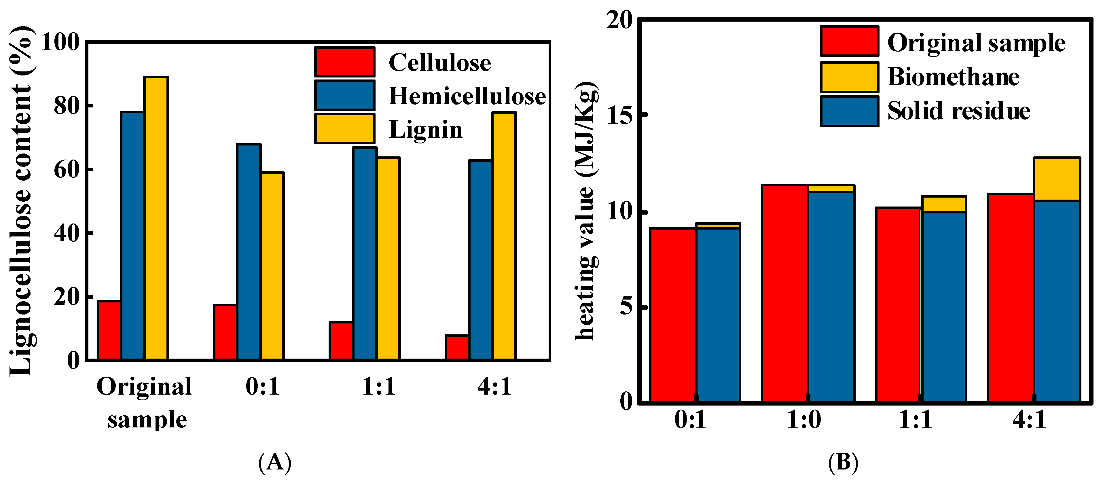 Figure 1A). This may be because sawdust are easily degraded by microorganisms, providing immediate energy and carbon sources, which stimulated microbial activity and enabled timely degradation of the accumulated organic acids—resulting from the increased C/N ratio—into methane, thereby reducing acid inhibition. Nevertheless, although sawdust have a high H/C ratio, their individual degradation yielded very little methane, which may be related to the structure, polymerization degree, surface functional groups, pore volume, and specific surface area of lignocellulose [