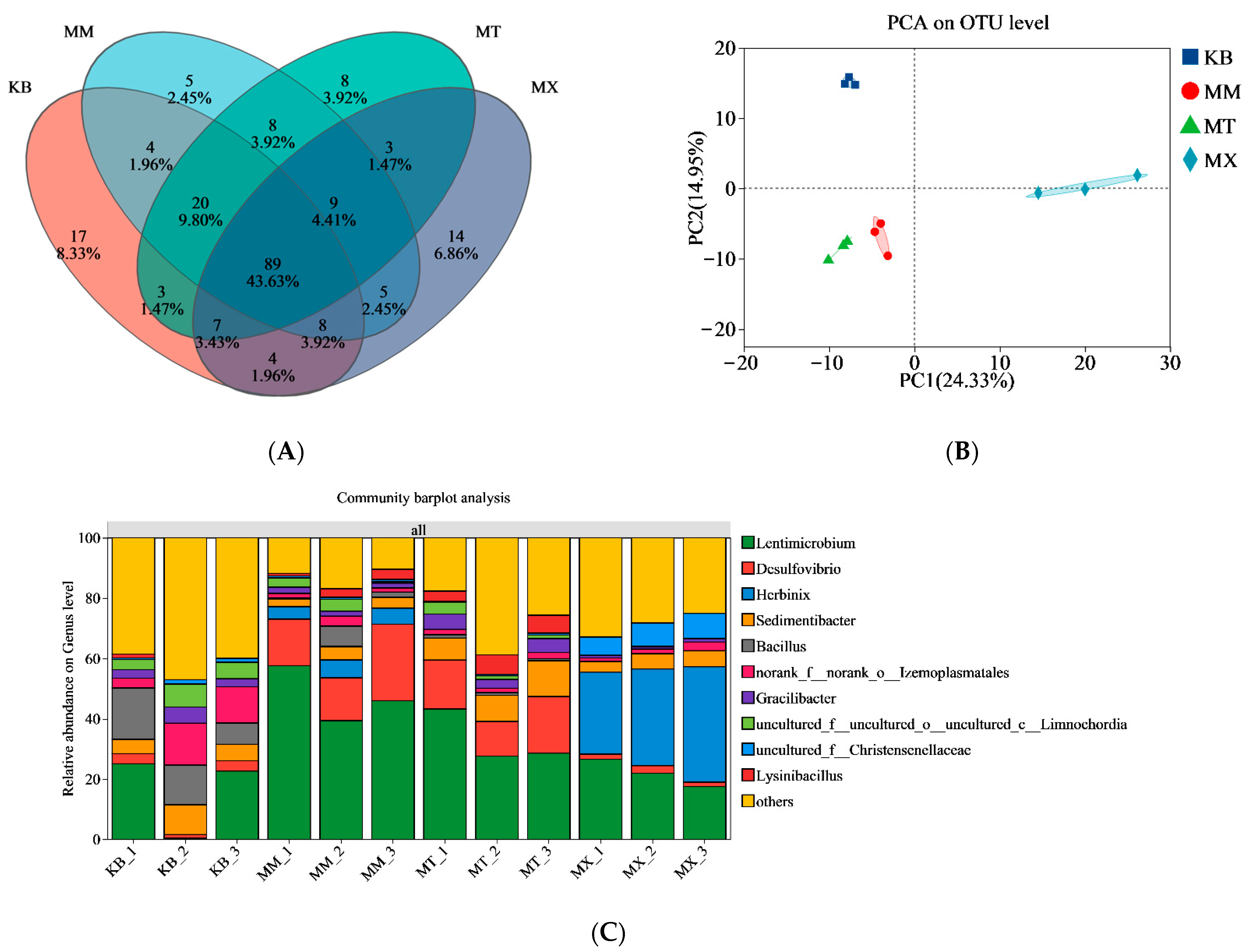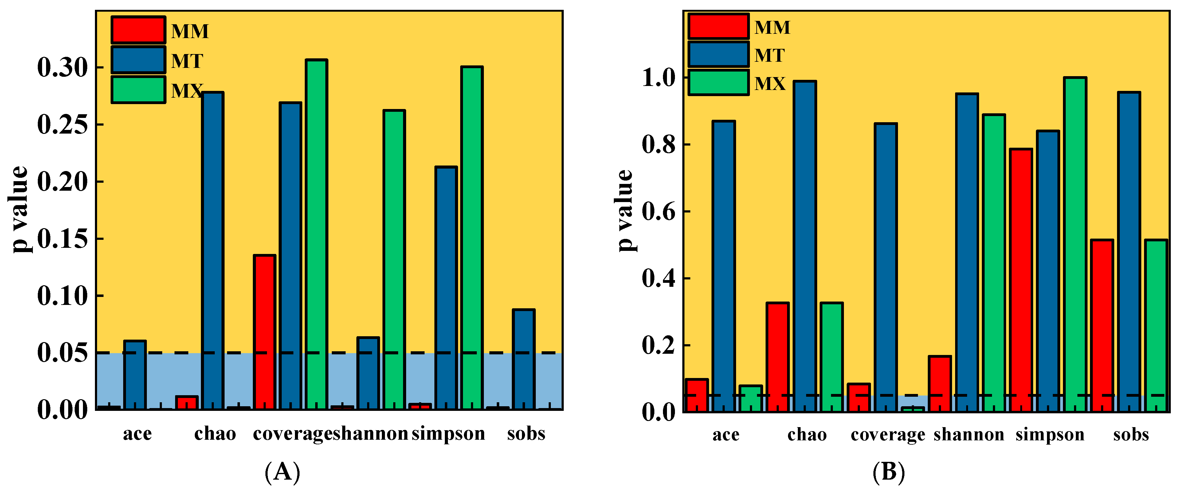 Table 5). This result indicated that coal-sawdust co-fermentation did not significantly alter archaeal species richness or community complexity. This stability suggests strong metabolic specialization and niche conservatism in the archaeal community. The addition of sawdust promoted the metabolism of certain functional bacteria, leading to increased bacterial richness and diversity in the MM group. However, as the woodchip content increased, the differences in community parameters between the MT and MX groups and the KB group decreased (