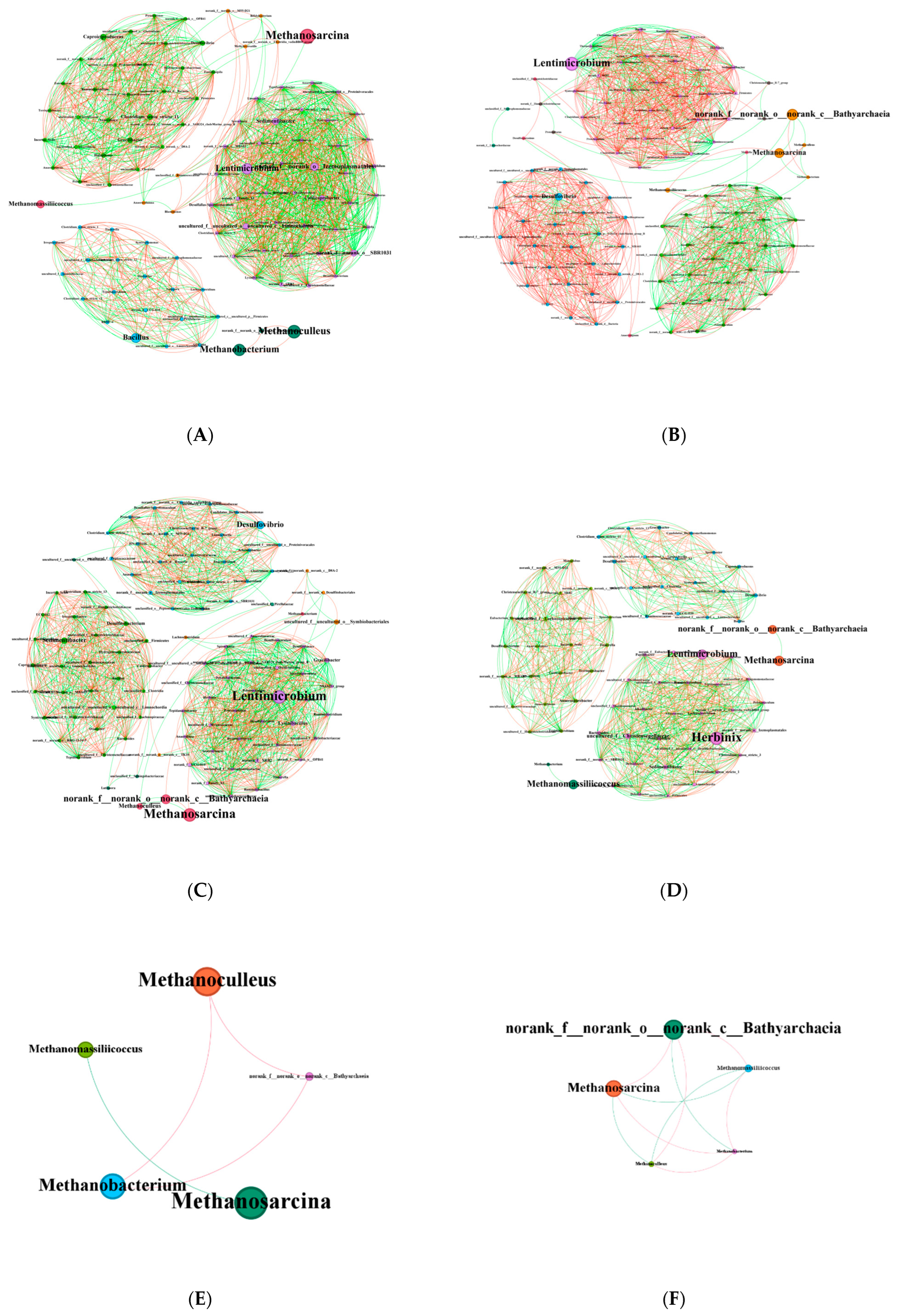 Figure 7). Analysis of the bacterial co-occurrence network revealed a compact “small-world” architecture with high microbial activity and strong interactions. A high average degree indicates strong co-occurrence relationships among microbial taxa during anaerobic degradation. As the proportion of sawdust in the substrate decreased, the community integration increased, with more complex and frequent species interactions. This likely stems from the recalcitrance and structural complexity of coal, which necessitates more intricate degradation pathways than those of sawdust. A high average eigenvector centrality indicates the presence of influential “core” species. These species form a hierarchical structure, which corresponds to the multi-stage reactions in anaerobic degradation. The bacterial communities in the experimental groups were more dependent than those in the control group on core species. This may imply reduced robustness but could also enable more efficient signal transduction. High graph density indicates tight internal connections and strong species interdependence. However, the highly integrated bacterial communities did not increase methane production. This may be attributed to the highly heterogeneous structure of coal, the non-stoichiometric nature of coal degradation reactions, and enzyme non-specificity. Although coal provides diverse degradation pathways, the concentration of bioavailable organic compounds in the liquid environment remains low. This limitation amplifies both functional redundancy and resource competition among microorganisms. Consequently, the overall efficiency of the system is reduced. In contrast, sawdust have a simpler structure and are more easily degraded, thereby releasing nutrients into the liquid environment. This explains why the graph density in the coal-containing groups was inversely correlated with sawdust content. Owing to substrate homogeneity, the MX group exhibited simpler degradation pathways, tighter bacterial connections, and higher graph densities than those of the coal-containing groups. Analysis of the archaeal communities indicated low diversity and high cohesion, with strong interactions among the archaeal genera. The addition of sawdust stimulated the emergence of functional archaea. This enhanced network complexity and stability while altering the dominant archaeal groups in the fermentation broth. Consequently, methanogenic pathways within the system were modified. These findings provide ecological insights into the assembly and functional dynamics of microbial communities in extreme environments.
