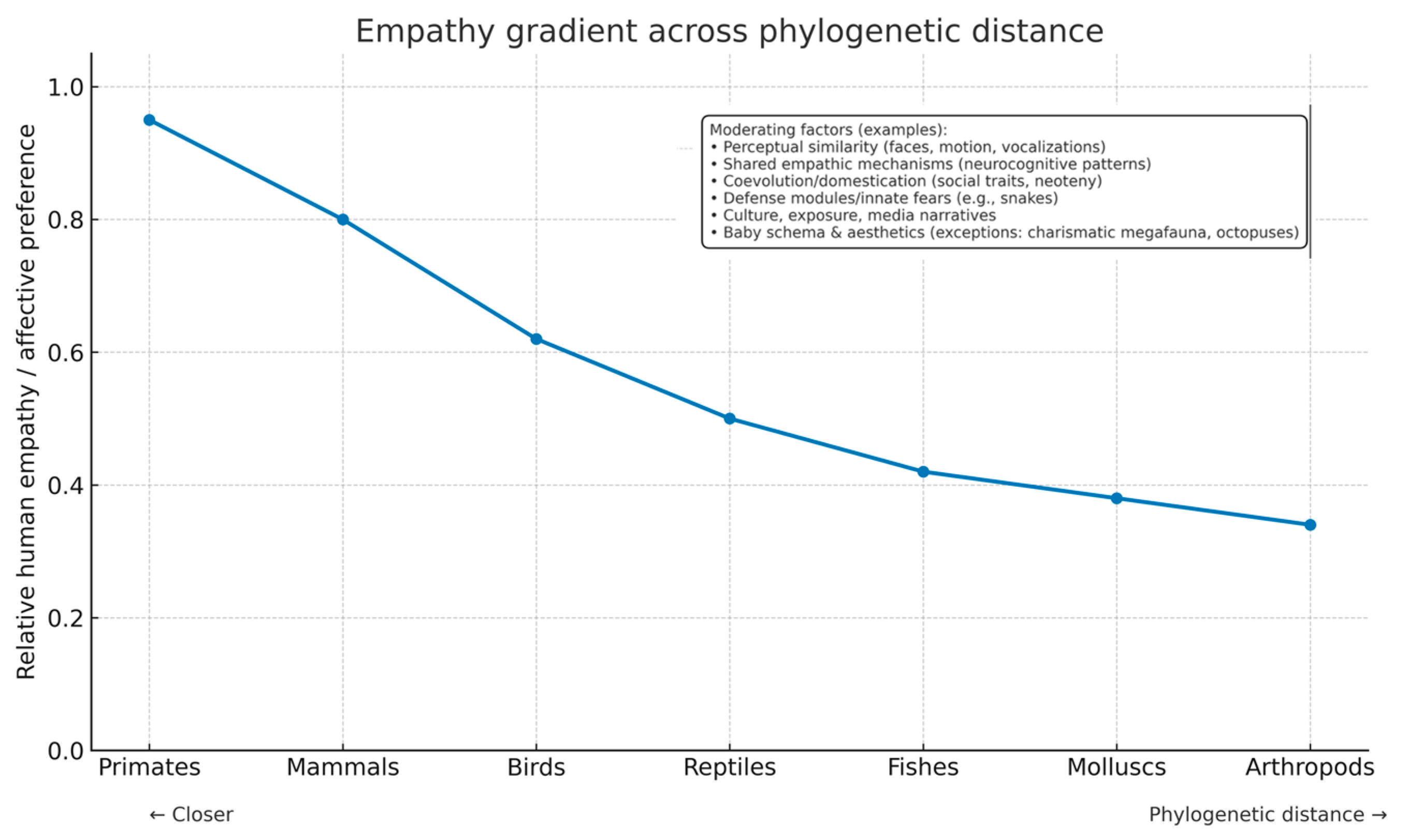 Humans readily form attachments to nonhuman animals, yet these attachments are not evenly distributed across the tree of life. Dogs, cats, horses, and great apes typically elicit warm affect; snakes, insects, or fish less so (Figure 1). Although individual exceptions are common, the population-level pattern is consistent in surveys, laboratory experiments, and behavioral choices (e.g., donations, adoption intentions, rescue priorities). This paper proposes a multi-level framework that treats empathy and preference as products of (i) evolutionary proximity and signal recognizability, (ii) neurocognitive architecture tuned for mammalian social cues, (iii) domestication and niche construction, and (iv) cultural learning and moral norms. Because empathy is partly predictive—an inference over internal states from perceptual cues—species that emit human-familiar signals are easier to model, and thus easier to care about.