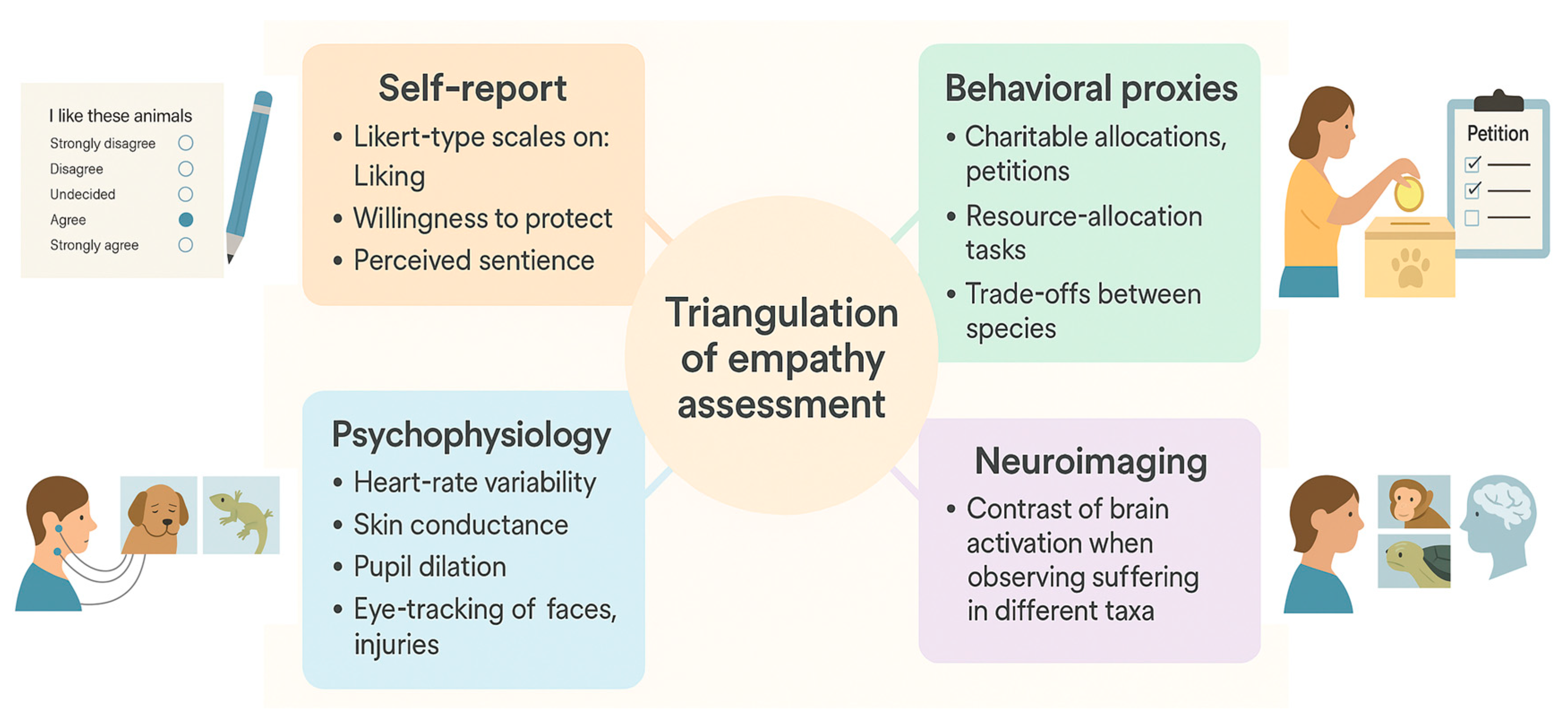 Figure 2. Triangulation of empathy assessment across multiple methodologies. Self-reports capture explicit attitudes (liking, protection, perceived sentience), while behavioral proxies index actual commitments (donations, petitions, allocation tasks). Psychophysiology records embodied reactivity (heart-rate variability, conductance, pupil dilation, gaze), and neuroimaging contrasts brain activation to animal suffering across taxa. Together these methods provide convergent evidence for a graded yet flexible structure of human–animal empathy.