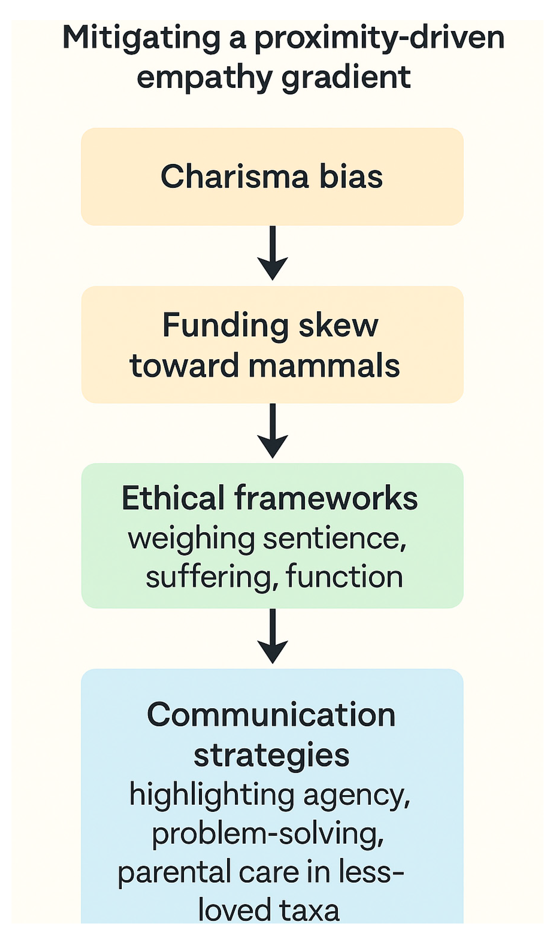 Figure 3. Charisma Bias in Conservation Decision-Making. This infographic illustrates the phenomenon of charisma bias, where public empathy and conservation funding disproportionately favor mammals and birds, while ecologically critical but less charismatic taxa (e.g., insects, amphibians, detritivores) receive less attention. Ethical frameworks that incorporate sentience, suffering capacity, and ecological function can counterbalance anthropocentric biases. Communication strategies emphasizing agency, problem-solving abilities, and parental care in underappreciated species provide practical tools to broaden public concern and foster more equitable biodiversity protection.