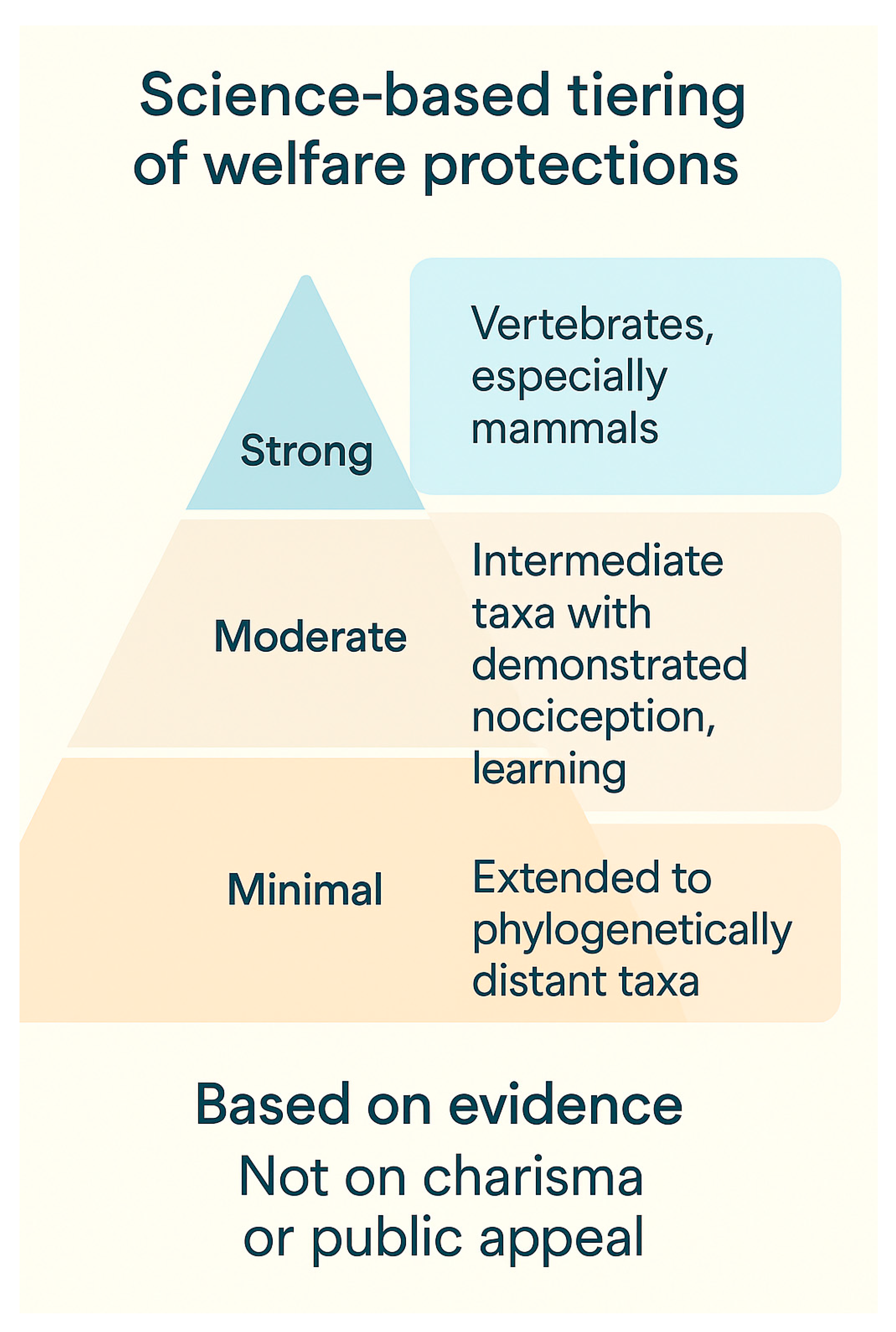 Legal protections for animals consistently mirror gradients of public empathy. In most jurisdictions, vertebrates—and particularly mammals—receive the strongest baseline protections, while invertebrates are often excluded or only weakly covered under welfare legislation. This anthropocentric asymmetry reflects both intuitive empathy gradients and historical inertia in policy-making [65]. Yet, scientific advances increasingly challenge these defaults. Experimental evidence now supports the capacity for nociception, associative learning, and even forms of problem-solving in several invertebrate clades, most prominently cephalopods.