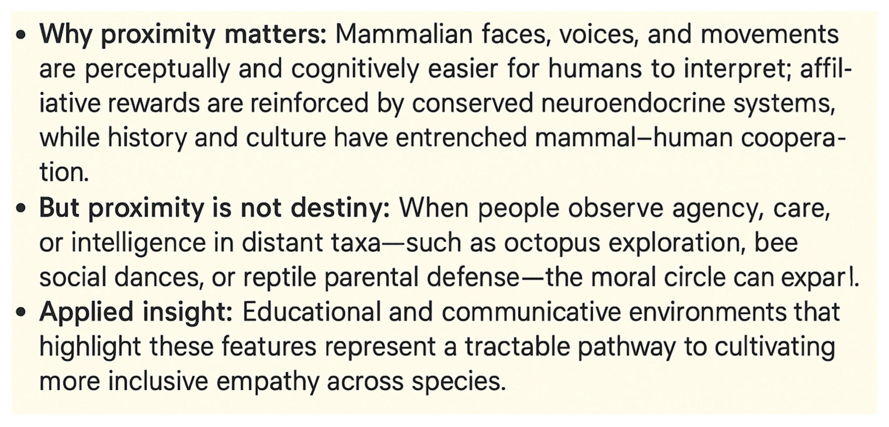 Proximity matters because it reduces perceptual and inferential distance: mammalian faces, voices, and motions are easier for human brains to parse; social rewards are amplified by conserved neuroendocrine systems; history and culture have built niches around mammal–human cooperation. Yet, proximity is not destiny: when observers witness agency, care, or intelligence in distant taxa—octopus exploration, bee social dances, reptile parental defense—the moral circle expands. Designing environments and messages that reveal these features is a tractable route to more inclusive empathy.