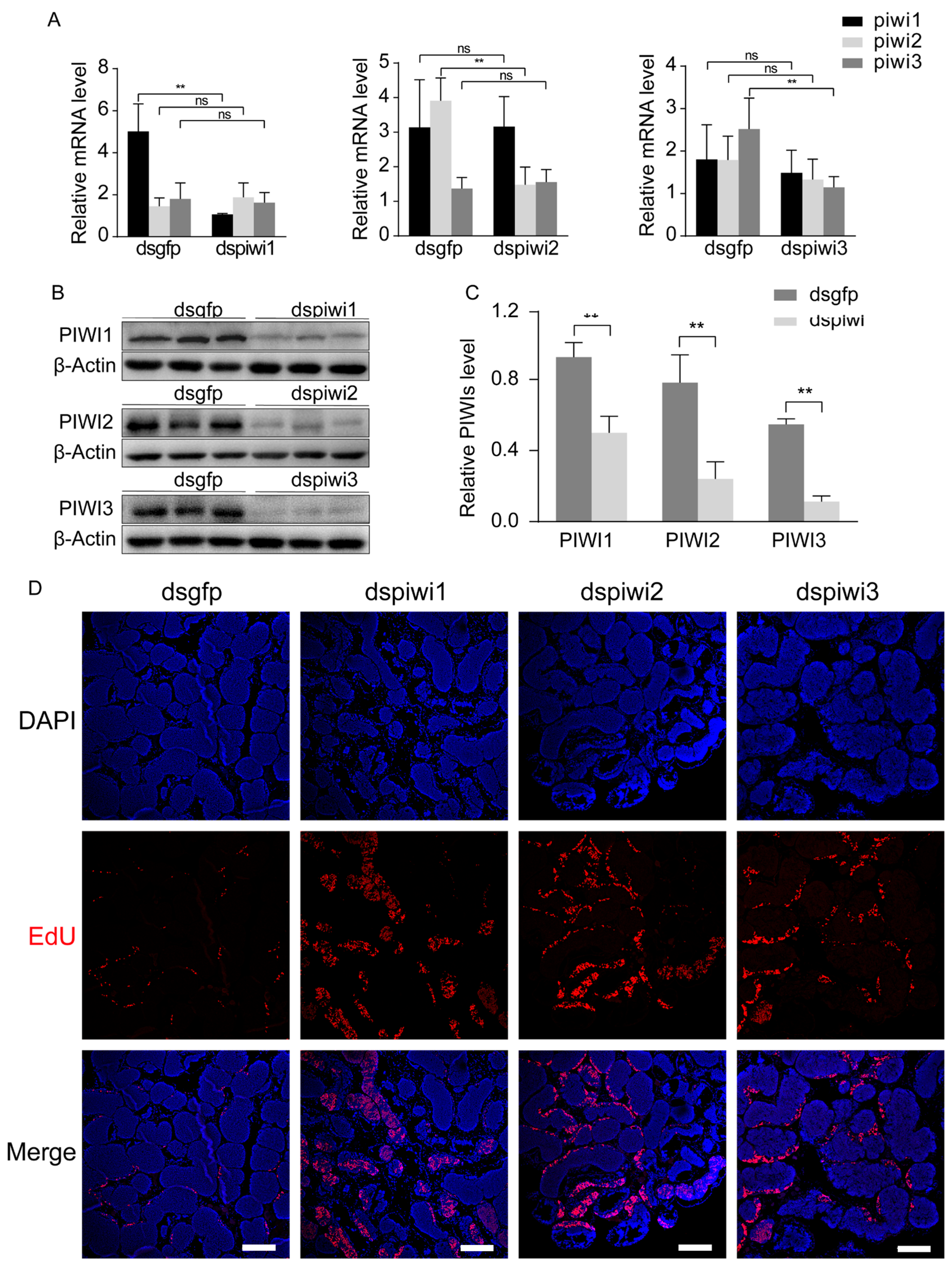 3.1. Effects of PIWI Deficiency on Spermatogonia Proliferation and Differentiation in E. sinensis