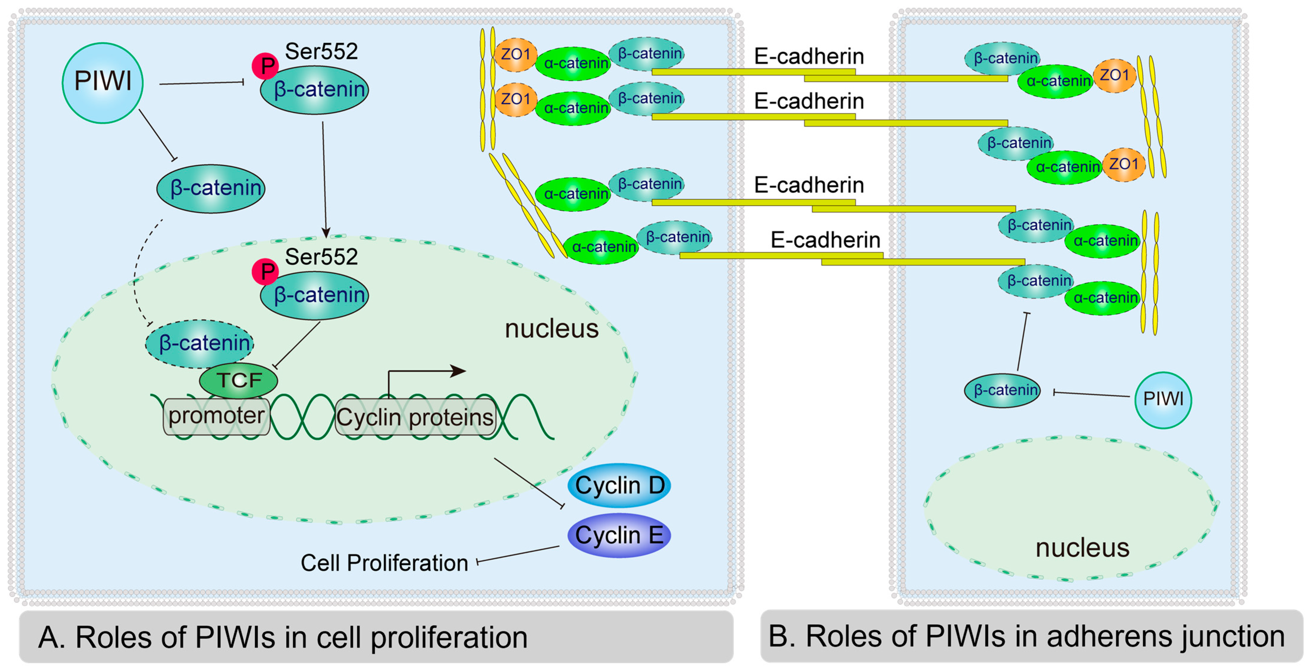 - Qiu, B.; Zeng, J.; Zhao, X.; Huang, L.; Ma, T.; Zhu, Y.; Liu, M.; Tao, D.; Liu, Y.; Lu, Y.; et al. PIWIL2 stabilizes β-catenin to promote cell cycle and proliferation in tumor cells. Biochem. Biophys. Res. Commun. 2019, 516, 819–824. [Google Scholar] [CrossRef]