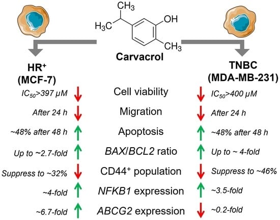 - Arunasree, K. Anti-proliferative effects of carvacrol on a human metastatic breast cancer cell line, MDA-MB 231. Phytomedicine 2010, 17, 581–588. [Google Scholar] [CrossRef]