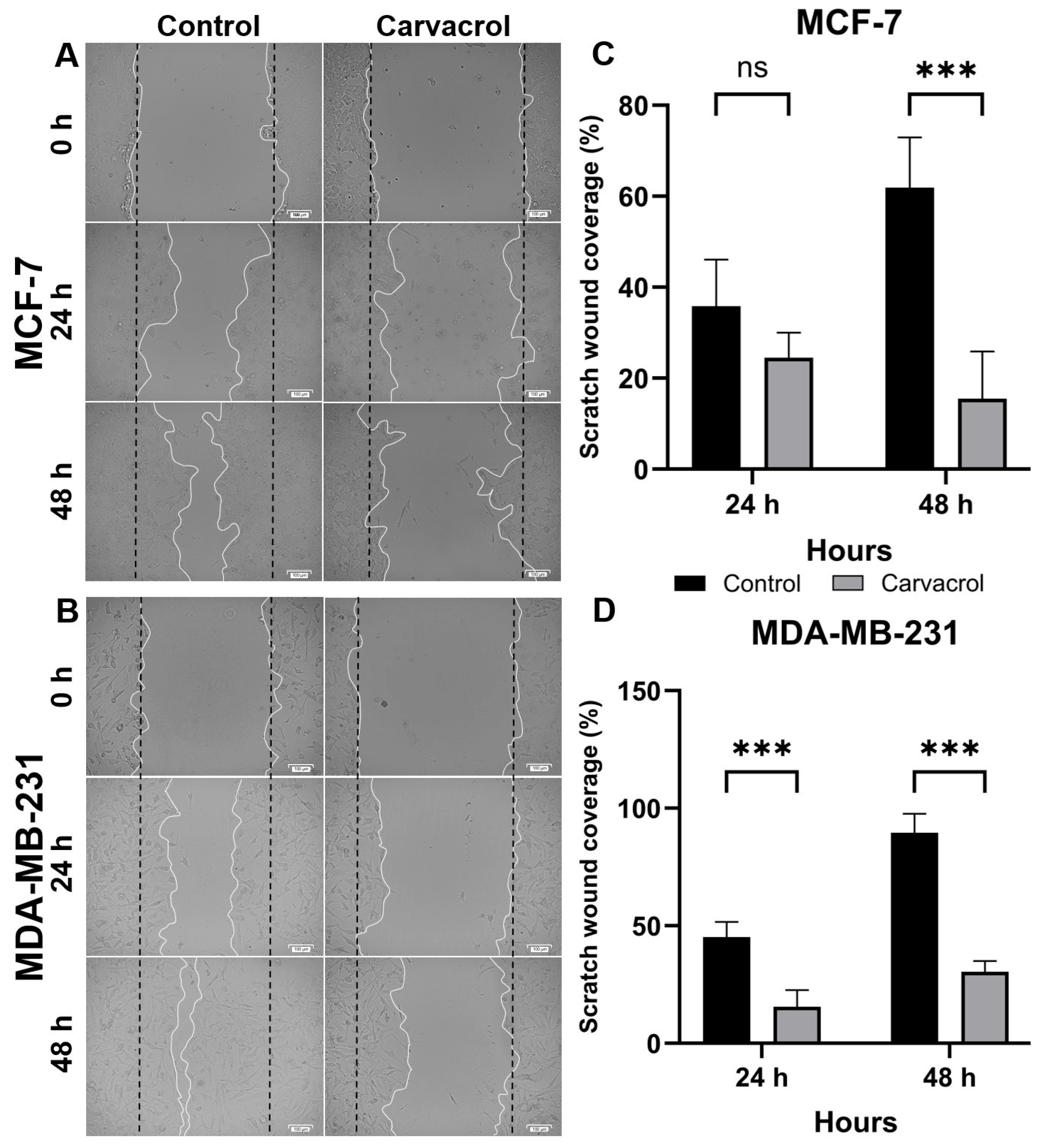 3.2. Carvacrol Suppresses Proliferation and Migration in Both HR+ and TNBC Cells