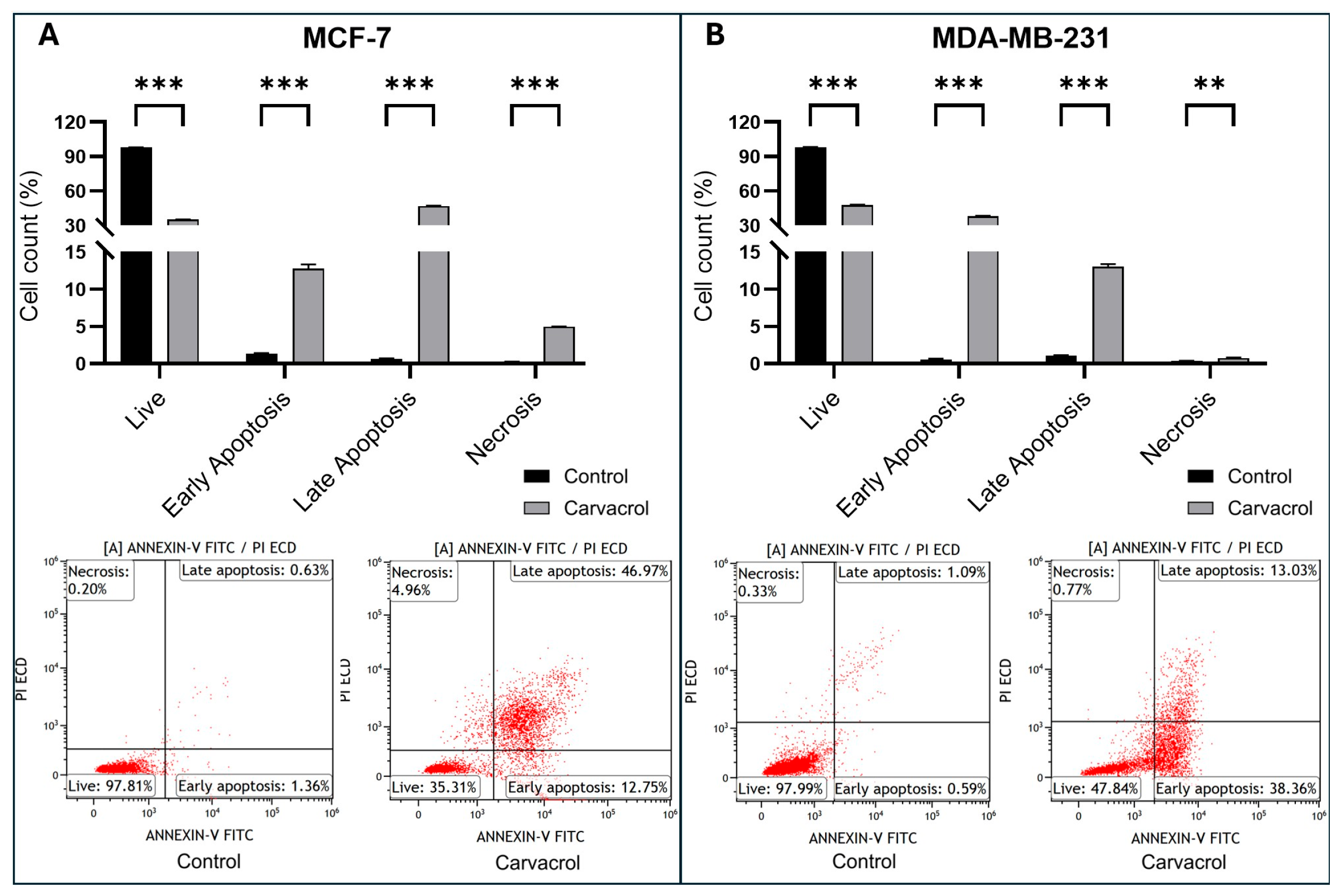 - Chen, H.-H.; Fong, S.Y. Carvacrol induces apoptosis in human breast cancer cells via Bcl-2/CytC signaling pathway. Res. Sq. 2022. [Google Scholar] [CrossRef]