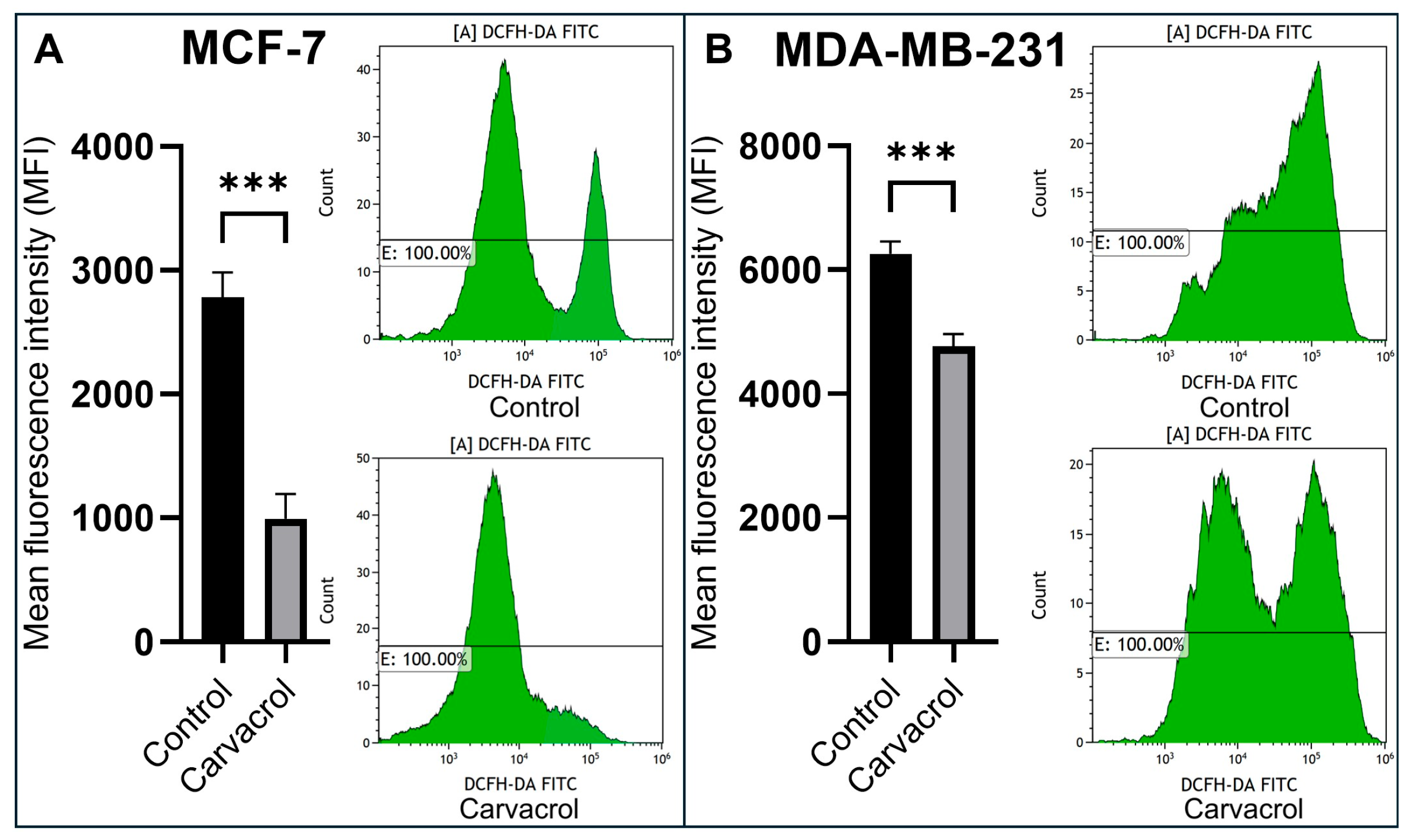- Moradipour, A.; Dariushnejad, H.; Ahmadizadeh, C.; Lashgarian, H.E. Dietary flavonoid carvacrol triggers the apoptosis of human breast cancer MCF-7 cells via the p53/Bax/Bcl-2 axis. Med. Oncol. 2022, 40, 46. [Google Scholar] [CrossRef]