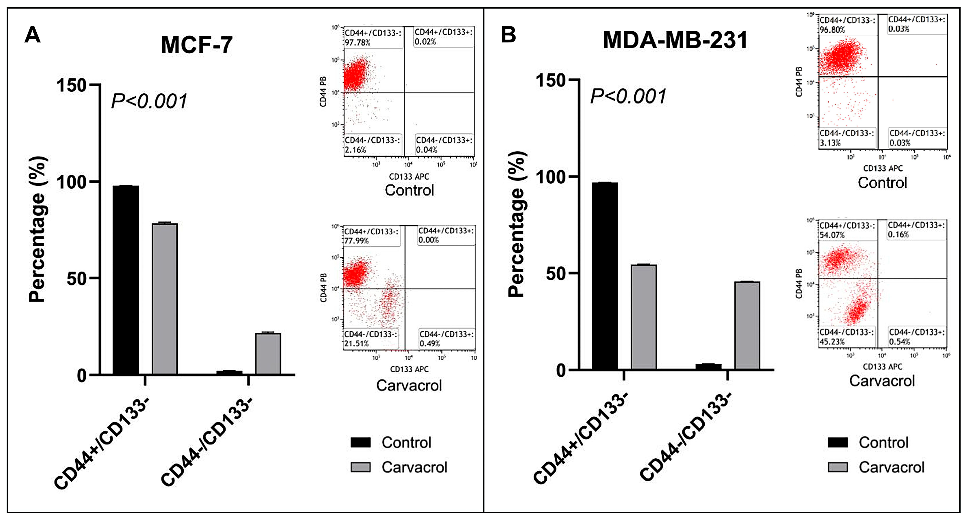 3.5. Carvacrol Downregulates CD44+ Stemness Marker in Both Subtypes