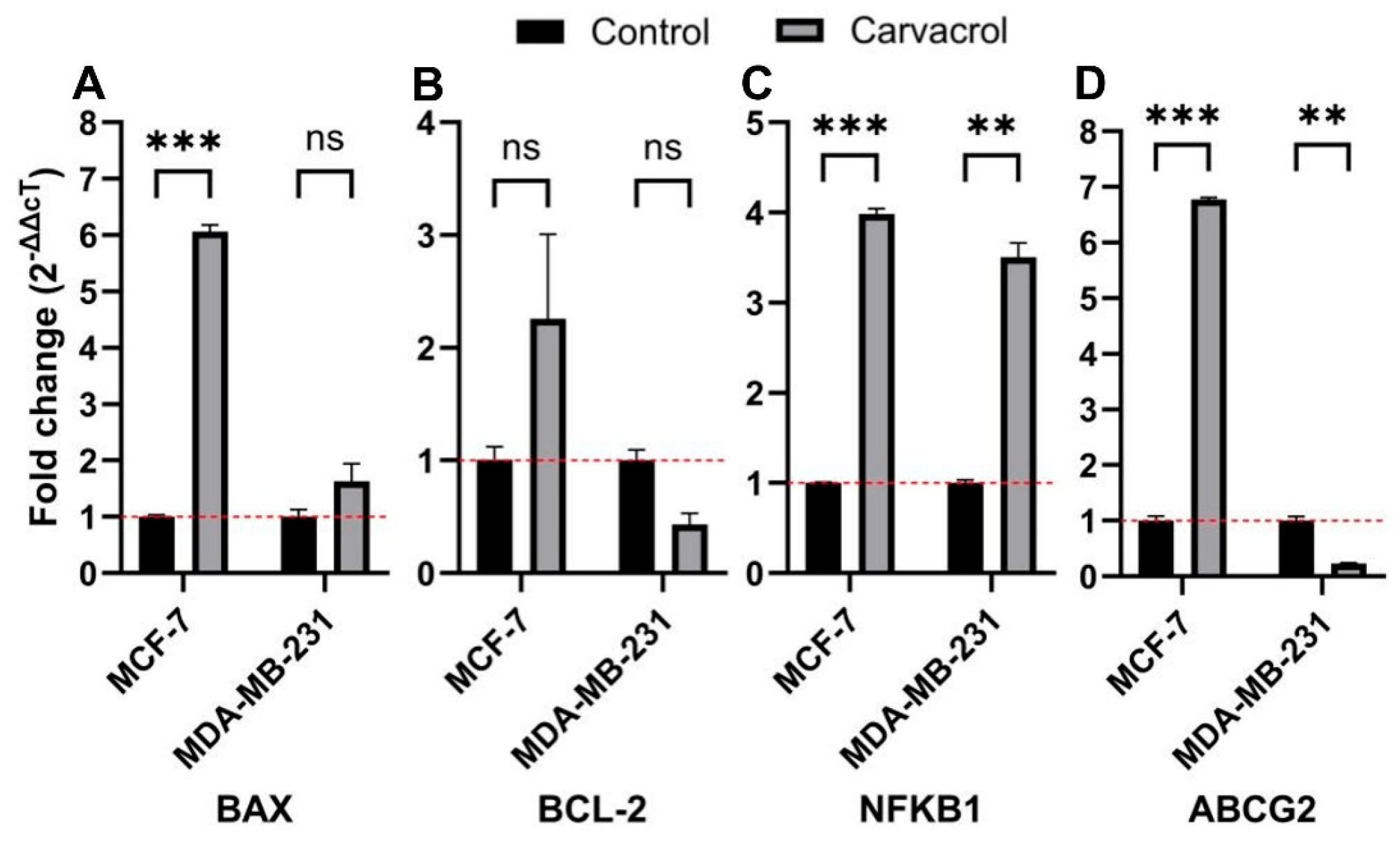 3.3. Carvacrol Induces Apoptosis via Modulation of BAX/BCL2 Ratio
