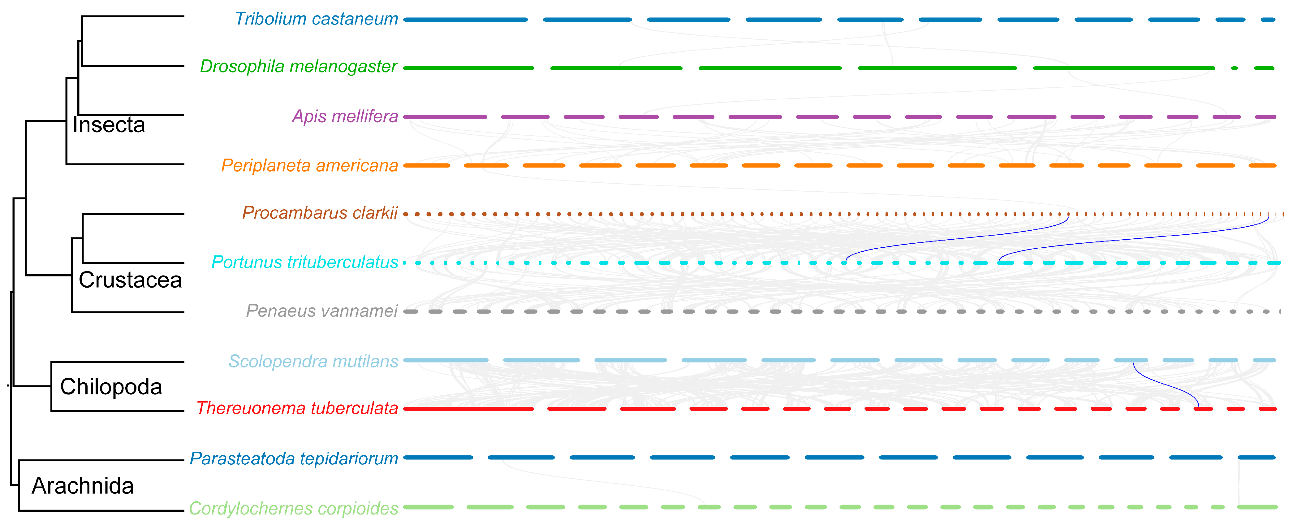 - Zhang, L.; Zhang, K.; Yang, F.; Dayananda, B.; Cao, Y.; Hu, Z.; Liu, Y. Chromosome-level genome of Scolopendra mutilans provides insights into its evolution. Integr. Zool. 2025, 20, 909–914. [Google Scholar] [CrossRef]
