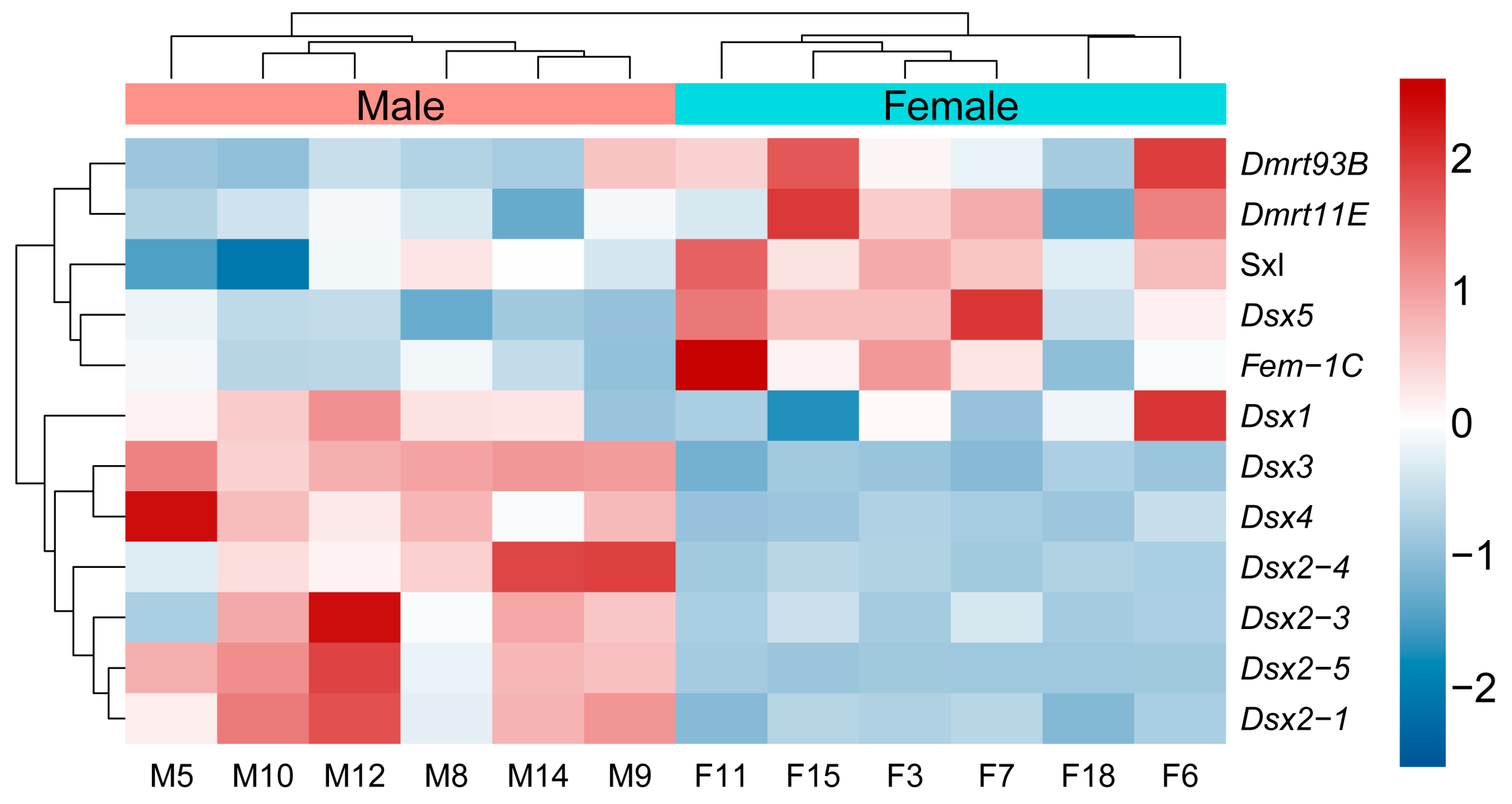 2.5. The Expression Pattern of Dmrt Transcription Factors in Males and Females