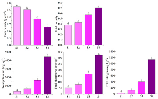 Bulk density, total porosity, and nutrient content of different substrates. The value corresponding to each column is the mean ± standard error (n = 3; p < 0.05). Different letters represent significant differences.