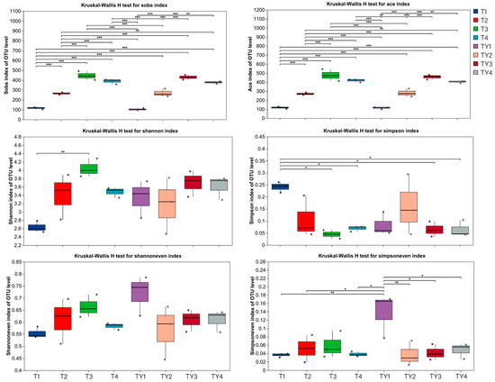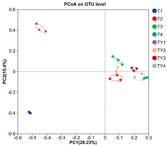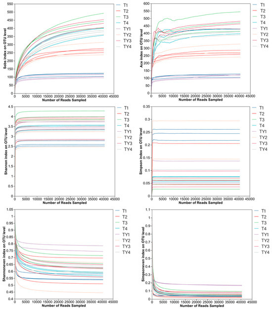 The Sobs and Ace indices of TY1 were significantly lower than those of TY2, TY3, and TY4. The Sobs and Ace indices of TY2 were significantly lower than those of TY3 and TY4. There were no significant differences in the Shannon and Simpson indices among TY1, TY2, TY3, and TY4. In addition, the Simpsoneven index of TY1 was significantly higher than that of TY2, TY3, and TY4 (Figure 3).