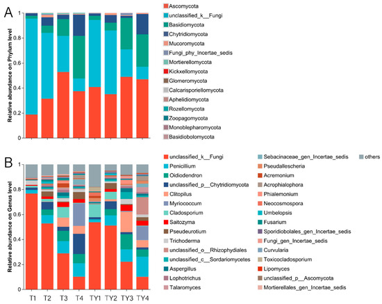 In the TY1/T1 comparison group, the relative abundance of Ascomycota increased, and that of unclassified_k__Fungi decreased. In the TY2/T2 comparison group, the relative abundance of Ascomycota increased slightly, and that of unclassified_k__Fungi decreased slightly. In the TY3/T3 comparison group, the relative abundances of Ascomycota and unclassified_k__Fungi decreased, and that of Basidiomycota increased. In the TY4/T4 comparison group, the relative abundance of Ascomycota increased, and that of Basidiomycota decreased.