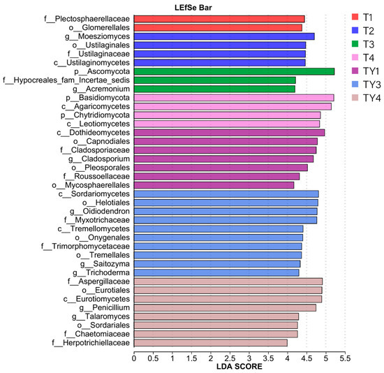 As shown in Figure 6 (LDA threshold > 2), o__Glomerellales and f__Plectosphaerellaceae were significantly enriched in T1. c__Ustilaginomycetes, f__Ustilaginaceae, o__Ustilaginales, and g__Moesziomyces were significantly enriched in T2. g__Acremonium, f__Hypocreales_fam_Incertae_sedis, and p__Ascomycota were significantly enriched in T3. In T4, c__Leotiomycetes, p__Chytridiomycota, c__Agaricomycetes, and p__Basidiomycota were significantly enriched. In TY1, o__Mycosphaerellales, f__Roussoellaceae, o__Pleosporales, g__Cladosporium, f__Cladosporiaceae, o__Capnodiales, and c__Dothideomycetes were significantly enriched. g__Trichoderma, g__Saitozyma, o__Tremellales, f__Trimorphomycetaceae, o__Onygenales, c__Tremellomycetes, f__Myxotrichaceae, g__Oidiodendron, o__Helotiales, and c__Sordariomycetes were significantly enriched in TY3. f__Herpotrichiellaceae, f__Chaetomiaceae, o__Sordariales, g__Talaromyces, g__Penicillium, c__Eurotiomycetes, o__Eurotiales, and f__Aspergillaceae were significantly enriched in TY4.