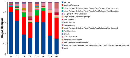 The relative abundances of Plant Saprotroph–Wood Saprotroph, Ectomycorrhizal, and Plant Pathogen in TY4 were much higher than those in TY1, TY2, and TY3. The relative abundances of Endophyte–Plant Pathogen, Epiphyte, Wood Saprotroph, Animal Pathogen–Endophyte–Fungal Parasite–Plant Pathogen–Wood Saprotroph, and Animal Pathogen–Endophyte–Lichen Parasite–Plant Pathogen–Wood Saprotroph in TY1 were higher than those in TY2, TY3, and TY4. In addition, the relative abundances of Undefined Saprotroph and Ericoid Mycorrhizal showed TY3 > TY4 > TY2 > TY1 (Figure 7).